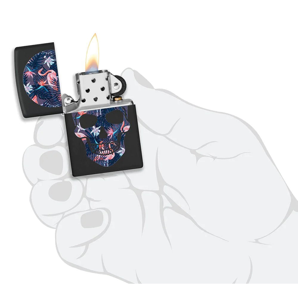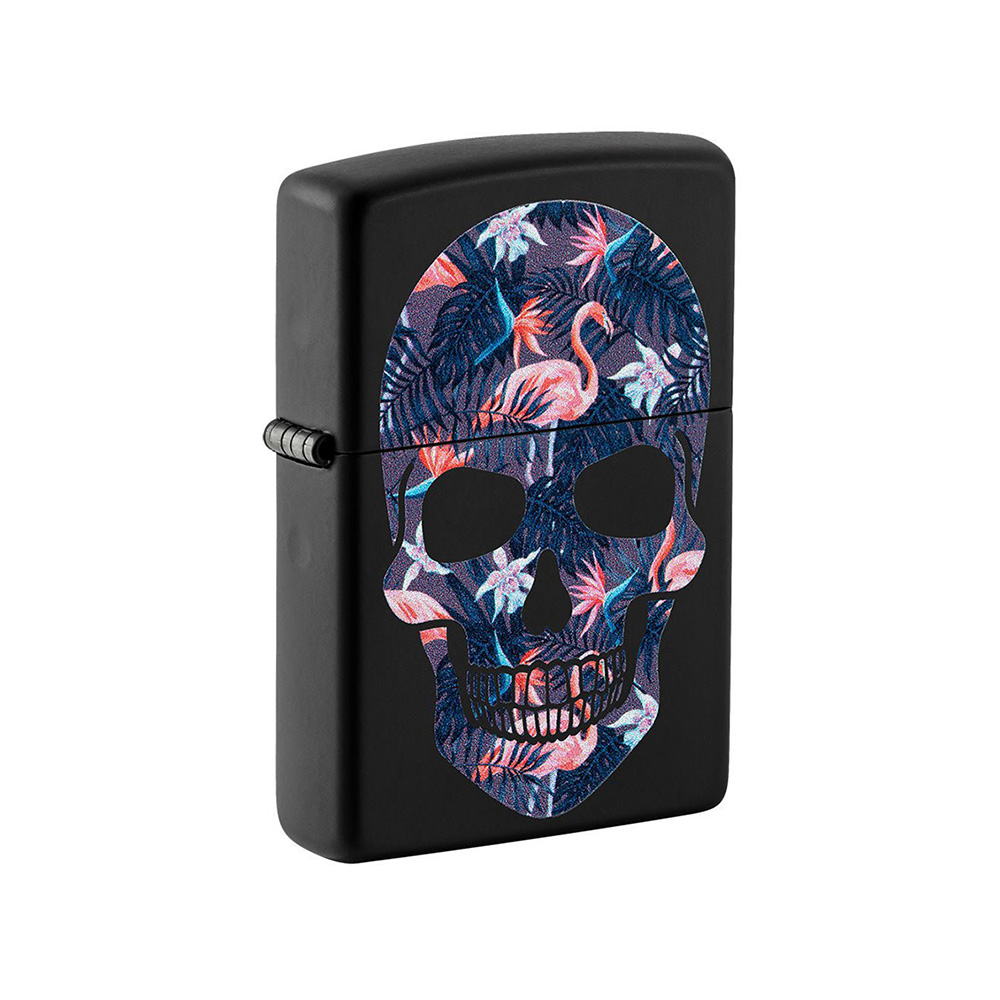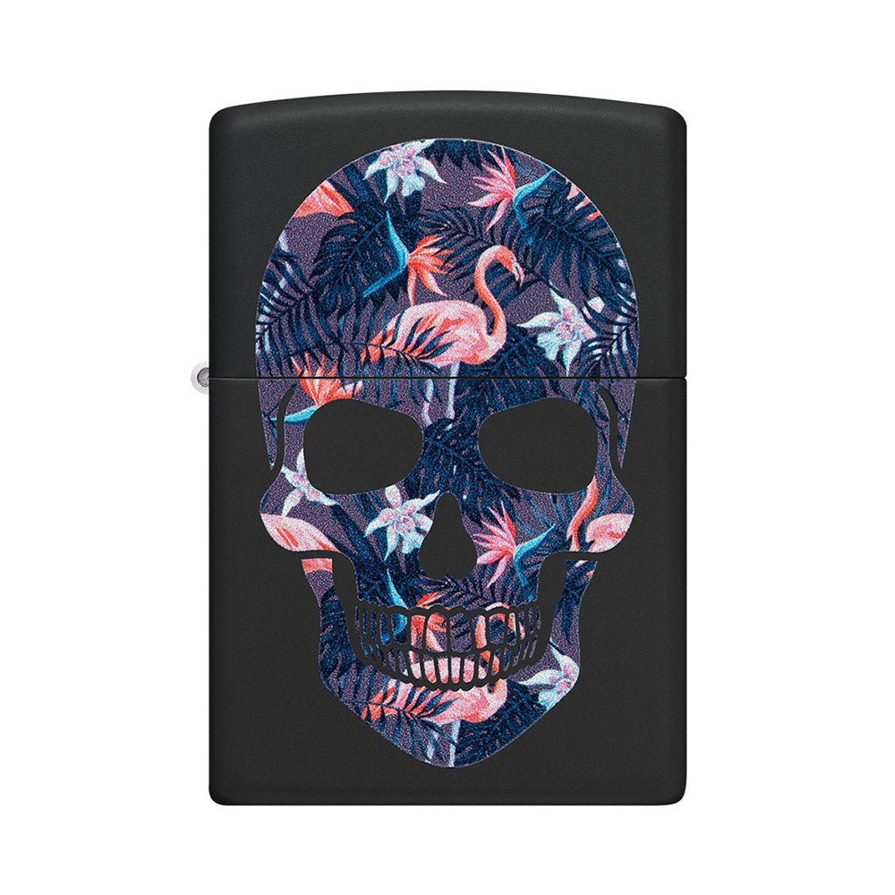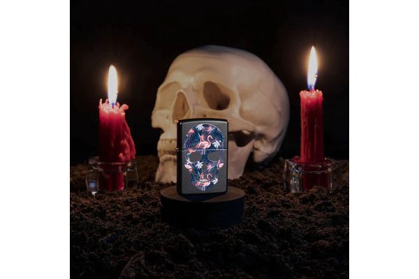 The eerie and sweet are combined in this macabre and playful Black Matte lighter. Flamingo and flowers fill a skull using the Color Image process.