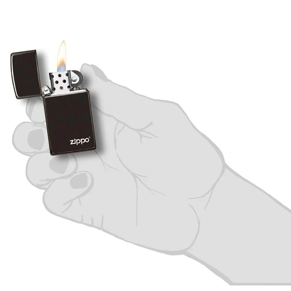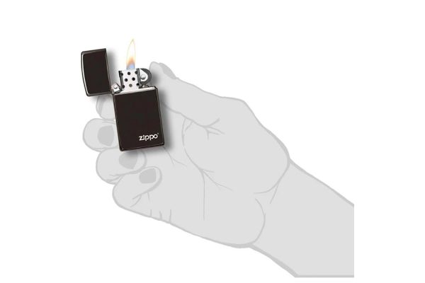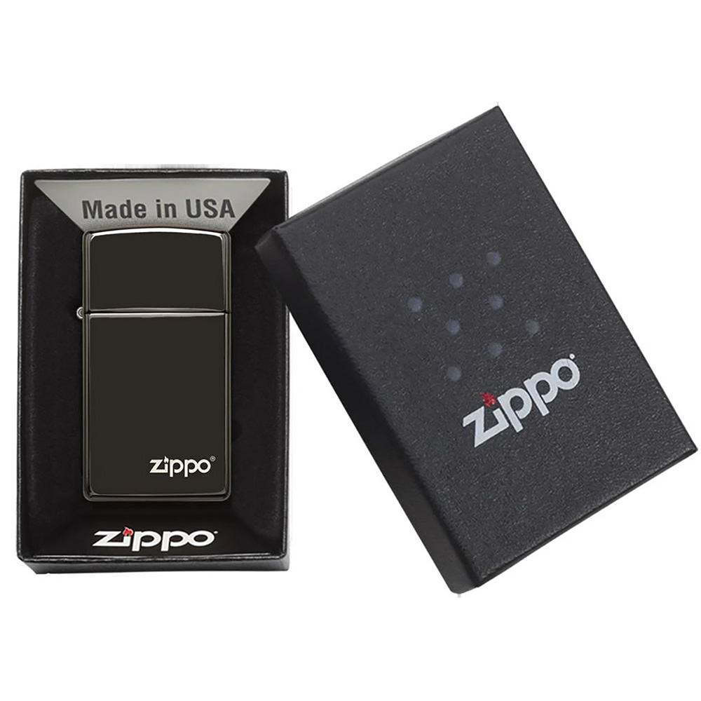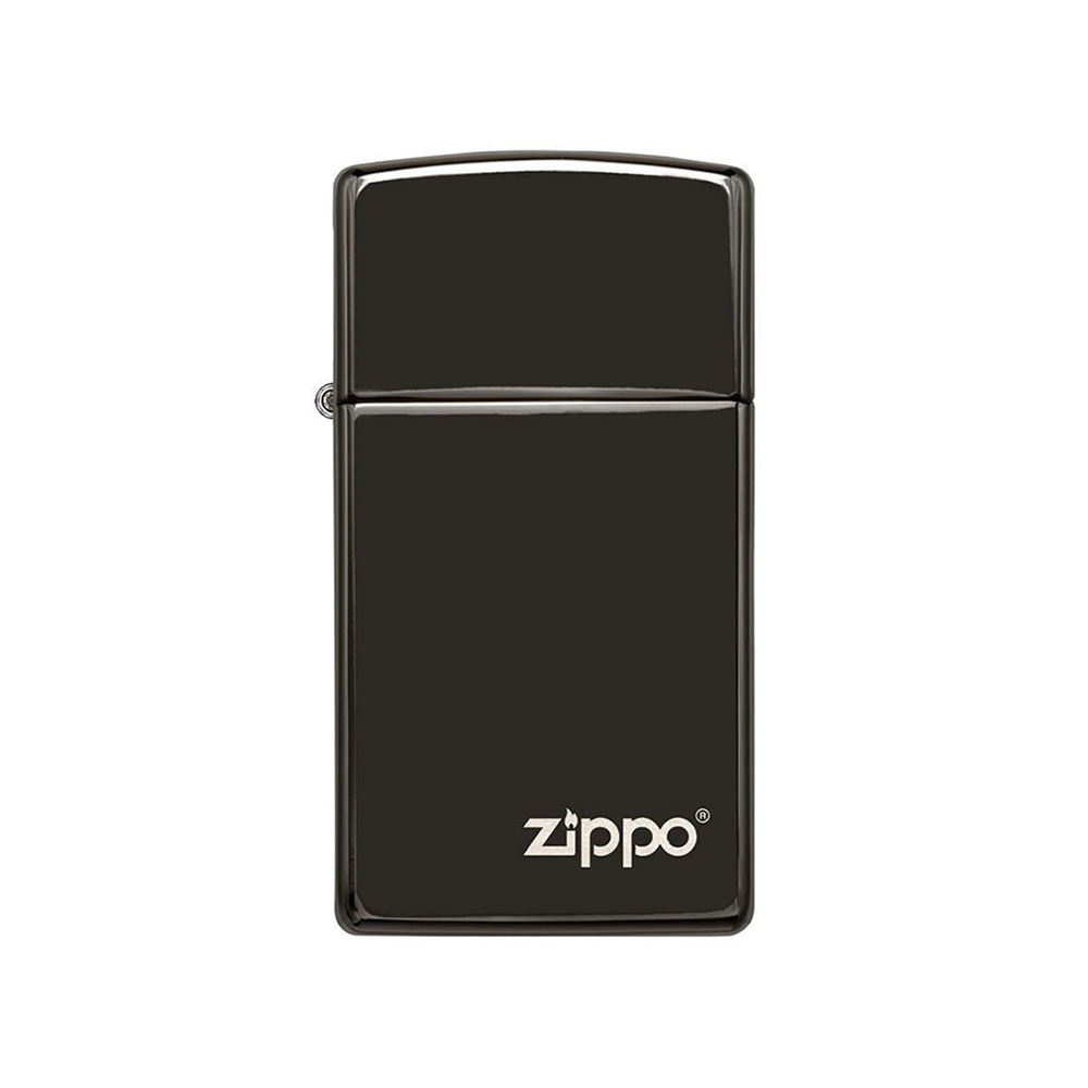 This Slim® wind-resistant lighter? He's almost as dark as night. This Slim® chromed lighter with the Zippo logo is connected to a very thin, scratch-resistant coating to achieve High Polish Black, Zippo's bright, intense black mirror-like finish.