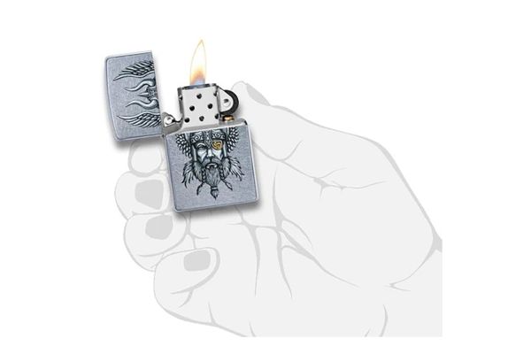 Αυτό το σκανδιναβικό Viking κάνει την εμφάνισή του, για πρώτη φορά σε έναν αναπτήρα Street Chrome™. Οι εσωτερικοί καλλιτέχνες της Zippo συνεχίζουν να παράγουν εντυπωσιακά πρωτότυπα έργα τέχνης για να κοσμούν τον αντιανεμικό αναπτήρα. Αυτό το χειροποίητο σχέδιο δημιουργήθηκε αρχικά με στυλό και μελάνι και στη συνέχεια μεταφέρθηκε προσεκτικά ψηφιακά για να διατηρηθούν τα περίπλοκα στρώματα λεπτομέρειας και σκίασης που θα αναπαραχθούν με τη διαδικασία έγχρωμης απεικόνισης της Zippo.