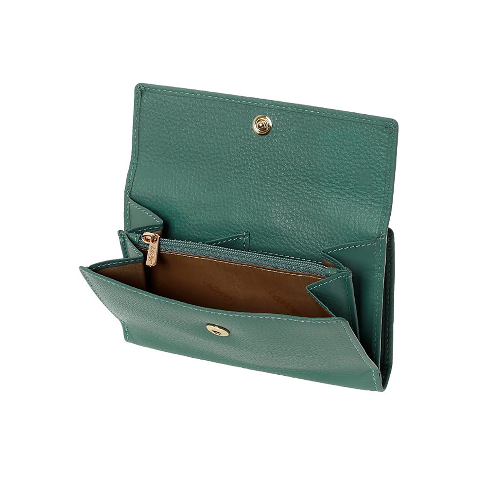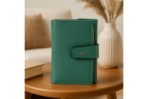 Ένα κομψό, λειτουργικό και απόλυτα θηλυκό πορτοφόλι, σχεδιασμένο για γυναίκες που θέλουν τέλεια οργάνωση χωρίς να χάνουν το στυλ τους.Το πράσινο δέρμα του προσθέτει μια elegant, μοντέρνα πινελιά ενώ το εξωτερικό κούμπωμα προσφέρει ασφάλεια και σταθερότητα στο άνοιγμα–κλείσιμο.