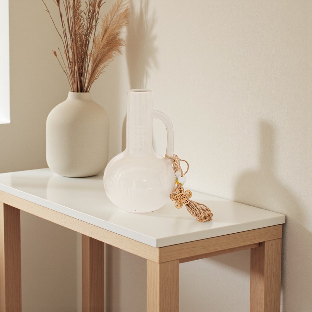 Απαλό, γήινο και διαχρονικό — το κεραμικό αυτό βάζο σε μπεζ απόχρωση φέρνει την ηρεμία της φυσικής απλότητας σε κάθε χώρο. Με στρογγυλεμένη φόρμα, διακριτική λάμψη και ρουστίκ διακοσμητική λεπτομέρεια από σχοινί και ξύλινο άνθος, αποτελεί ιδανική επιλογή για minimal ή boho διακόσμηση.
