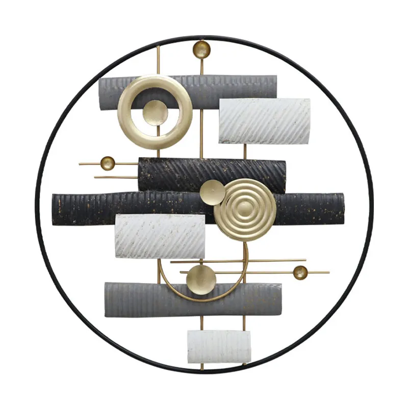 Το στρογγυλό μεταλλικό διακοσμητικό τοίχου σε χρυσό, μαύρο και γκρι αποτελεί μια μοντέρνα και ισορροπημένη σύνθεση που δίνει στον χώρο χαρακτήρα και σύγχρονη αισθητική. Οι αφηρημένες σειρές και οι κυκλικές λεπτομέρειες δημιουργούν ένα εντυπωσιακό παιχνίδι γεωμετρίας και υφών, ενώ το χρυσό μέταλλο προσθέτει διακριτική πολυτέλεια. Ιδανικό για σαλόνι, γραφείο ή είσοδο, αποτελεί μια κομψή λύση για όσους αναζητούν σύγχρονη διακόσμηση που τραβάει το βλέμμα χωρίς υπερβολές.