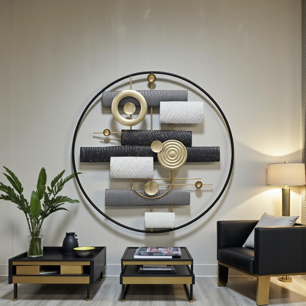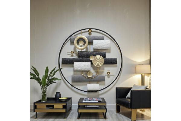 Πρόκειται για ένα κομμάτι που ενώνει το μοντέρνο design με διακριτή πολυτέλεια, χάρη στον ισορροπημένο συνδυασμό χρυσών, μαύρων και γκρι αποχρώσεων. Η αφηρημένη σύνθεση και οι γεωμετρικές γραμμές αναβαθμίζουν άμεσα τον χώρο, ενώ το στρογγυλό πλαίσιο προσφέρει αρμονία και καθαρή αισθητική. Είναι μια ιδανική επιλογή για όσους θέλουν ένα σύγχρονο, καλοδουλεμένο διακοσμητικό που ταιριάζει εύκολα με πολλά στυλ και χρωματικά παλέτες.