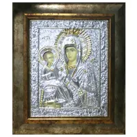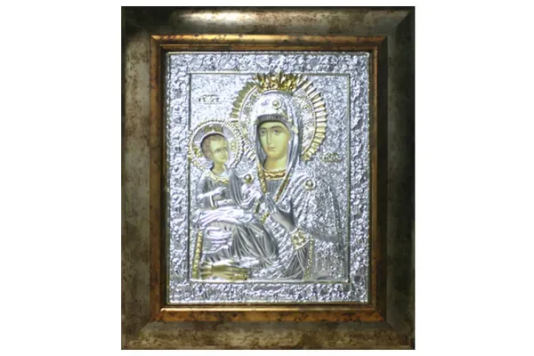 ΘΡΗΣΚΕΥΤΙΚΗ ΕΙΚΟΝΑ ΑΛΟΥΜΙΝΙΟΥ ΜΕ ΧΡΥΣΕΣ ΛΕΠΤΟΜΕΡΕΙΕΣ ΚΑΙ ΠΑΛΑΙΩΜΕΝΗ ΚΟΡΝΙΖΑ - ΘΕΜΑ: ΠΑΝΑΓΙΑ ΤΡΙΧΕΡΟΥΣΑ - ΥΛΙΚΟ: ΑΛΟΥΜΙΝΙΟ, ΞΥΛΟ - ΔΙΑΣΤΑΣΕΙΣ: 40x46cm - ΚΙΒΩΤΙΟ: -/- ALUMINUM RELIGIOUS WITH GOLDEN DETAILS AND OLD FRAMEWORK - THEME: TRICHEROUSA VIRGIN - MATERIAL: ALUMINUM, WOOD - DIMENSIONS: 40x46cm - BOX: -/-
