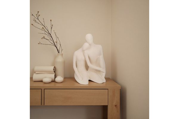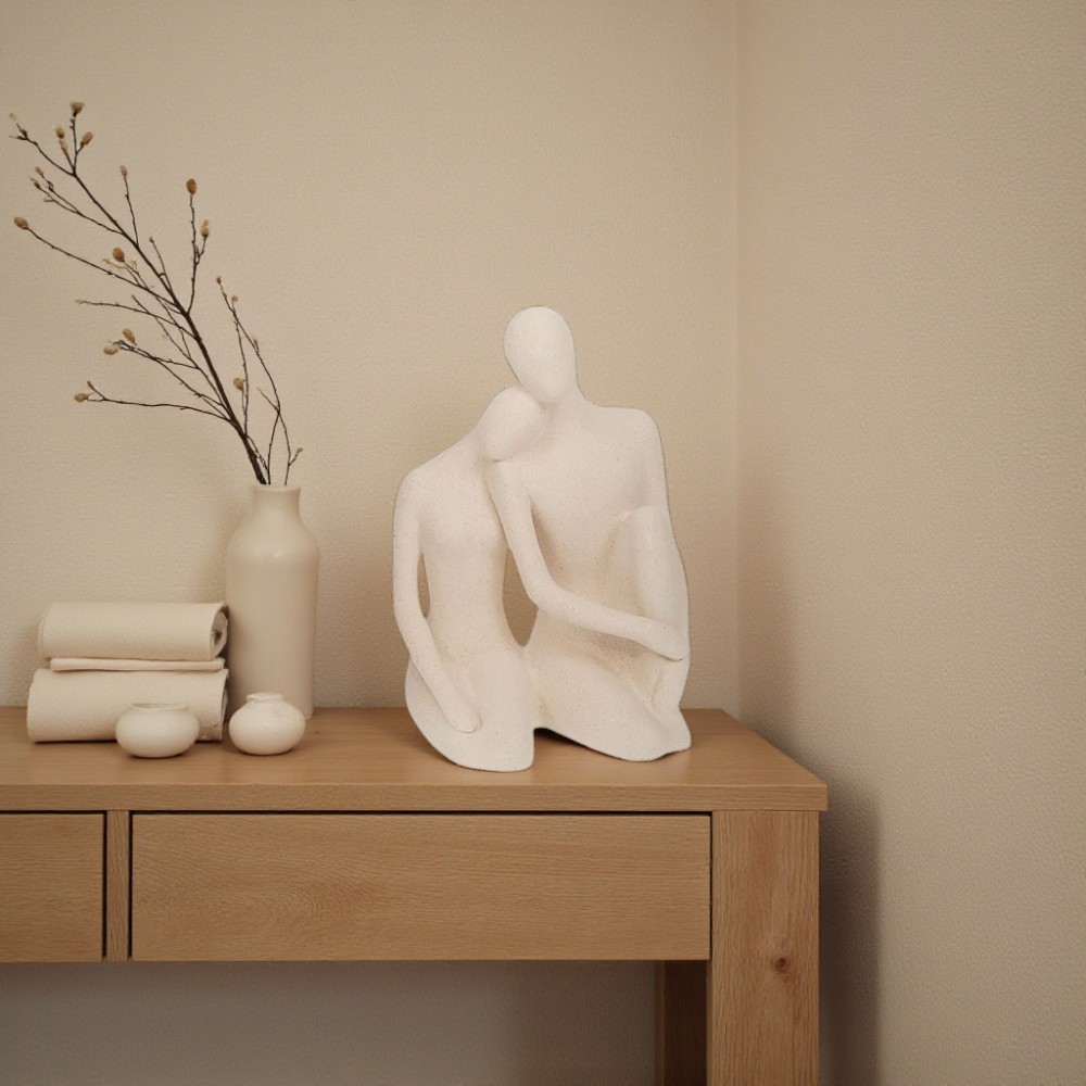 Μια μίνιμαλ φιγούρα που αποτυπώνει την τρυφερότητα και την ηρεμία της ανθρώπινης σύνδεσης. Το κεραμικό αγαλματίδιο απεικονίζει ένα ζευγάρι σε αγκαλιά, αποπνέοντας ρομαντισμό και γαλήνη. Η απαλή μπεζ απόχρωση και οι λιτές γραμμές του το καθιστούν ιδανικό για χώρους που αναζητούν κομψότητα και συναισθηματική αρμονία.