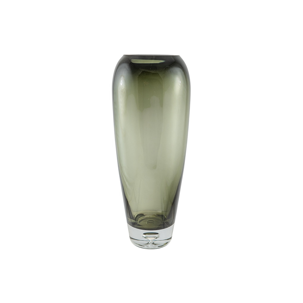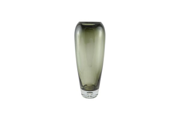 Η απαλή γκρι-καπνιστή απόχρωση και η επιμήκης, αρμονική φόρμα του δημιουργούν μια αίσθηση ηρεμίας και σύγχρονης κομψότητας. Το φυσητό γυαλί αγκαλιάζει το φως με τρόπο διακριτικό αλλά ζεστό, ενώ η διάφανη βάση προσθέτει μια αίσθηση καθαρότητας και λεπτότητας. Ένα βάζο που «ηρεμεί» το μάτι και γεμίζει τον χώρο με μια understated πολυτέλεια.