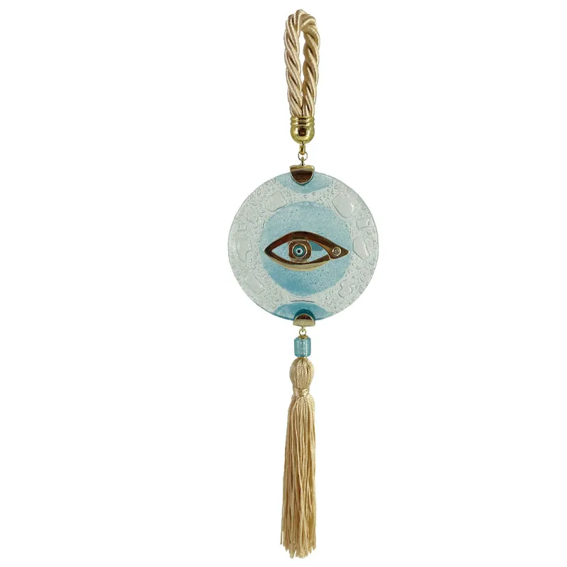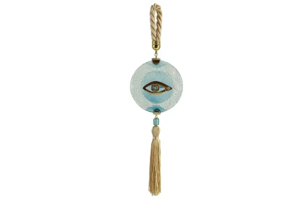 ΚΡΕΜΑΣΤΟ ΓΟΥΡΙ ΜΕ ΦΥΣΗΤΟ ΓΥΑΛΙ - ΧΡΩΜΑ: ΕΚΡΟΥ, ΣΙΕΛ , ΛΕΥΚΟ, ΧΡΥΣΟ - ΣΤΟΙΧΕΙΑ: ΜΑΤΙ, ΧΑΝΤΡΑ, ΦΟΥΝΤΑ - ΥΛΙΚΑ: ΚΟΡΔΟΝΙ, ΓΥΑΛΙ, ΜΕΤΑΛΛO, ΚΛΩΣΤΕΣ, ΑΚΡΥΛΙΚΟ - ΔΙΑΣΤΑΣΕΙΣ: Υ35cm HANGING CHARM WITH NATURAL GLASS - COLOR: CREAM, CYAN, WHITE, GOLD - ELEMENTS: EYE, BEAD, TUFT - MATERIALS: CORD, GLASS, METAL, THREAD, ACRYLIC - DIMENSIONS: Η35cm