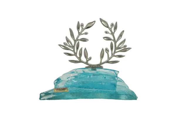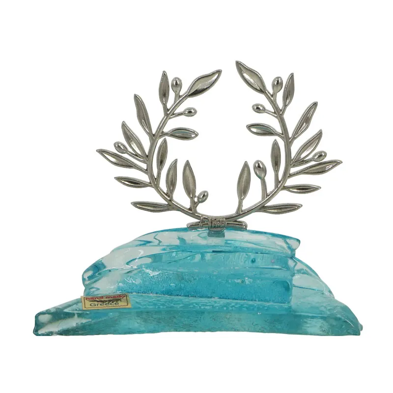 ΕΠΙΤΡΑΠΕΖΙΟ ΔΙΑΚΟΣΜΗΤΙΚΟ ΓΥΑΛΙΝΟ ΦΟΥΤΖΙ - ΘΕΜΑ: ΣΤΕΦΑΝΙ ΕΛΙΑΣ - ΧΡΩΜΑ: ΤΙΡΚΟΥΑΖ ΓΥΑΛΙ, ΣΤΕΦΑΝΙ ΑΣΗΜΙ, - ΥΛΙΚΑ: ΓΥΑΛΙ ΦΟΥΤΖΙ, ΜΕΤΑΛΛO - ΔΙΑΣΤΑΣΕΙΣ: 12x10.5cm TABLE DECORATIVE FUISHING ART GLASS - THEME: OLIVE CROWN - COLOR: TURQUOISE GLASS, SILVER CROWN - MATERIALS: FUISHING GLASS, METAL - DIMENSIONS: 12x10.5cm