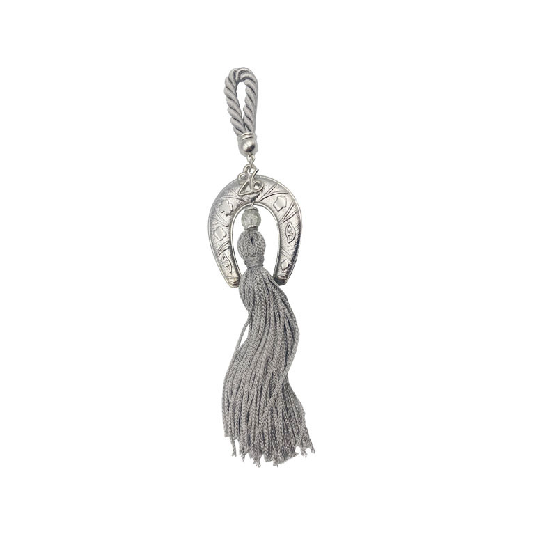 ΓΟΥΡΙ ΚΡΕΜΑΣΤΟ ΠΕΤΑΛΟ ΤΥΧΗΣ - ΧΡΩΜΑ: ΑΣΗΜΙ, ΓΚΡΙ - ΥΛΙΚΑ: ΜΕΤΑΛΛΟ, ΚΟΡΔΟΝΙ, ΦΟΥΝΤΑ ΔΙΑΣΤΑΣΕΙΣ / DIMΕNSIONS: Υ/Η 23cm LUCKY HORSESHOE HANGING GIFT - COLOR: SILVER, GREY - MATERIALS: IRON, CORD, TUFT