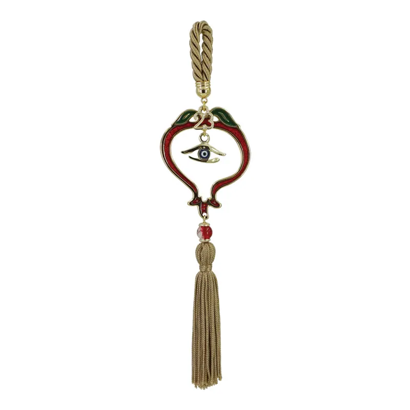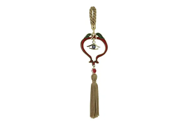 ΔΙΑΚΟΣΜΗΤΙΚΟ ΚΡΕΜΑΣΤΟ ΓΟΥΡΙ - ΧΡΩΜΑ: ΜΠΕΖ-KOKKINO-ΧΡΥΣΟ-ΠΡΑΣΙΝΟ - ΘΕΜΑ: ΡΟΔΙ-ΦΥΛΛΑ-ΜΑΤΙ-ΕΤΟΣ - ΥΛΙΚΑ: ΜΕΤΑΛΛO, ΣΜΑΛΤΟ, ΧΑΝΤΡΑ, ΚΟΡΔΟΝΙ, ΦΟΥΝΤΑ - YΨΟΣ: 24cm DECORATION HANGING GIFT - COLOR: BEIGE-RED-GOLD-GREEN - THEME: POMEGRANATE-LEAVES-EYE-YEAR - MATERIALS: METAL, ENAMEL, BEAD, CORD, TASSEL - HEIGHT: 24cm