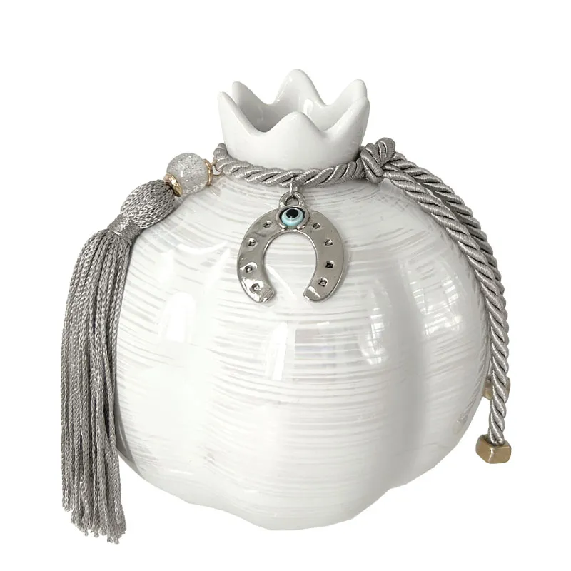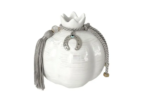 ΔΙΑΚΟΣΜΗΤΙΚΟ ΕΠΙΤΡΑΠΕΖΙΟ ΡΟΔΙ ΣΤΟΛΙΣΜΕΝΟ - ΧΡΩΜΑ: ΛΕΥΚΟ - ΣΤΟΛΙΣΜΑ: ΑΣΗΜΙ ΠΕΤΑΛΟ, KΟΡΔΟΝΙ, ΦΟΥΝΤΑ - ΥΛΙΚΟ: ΚΕΡΑΜΙΚΟ - ΔΙΑΣΤΑΣΕΙΣ: Φ12.3x13cm - ΚΙΒΩΤΙΟ: 1 TABLE POMEGRANATE DECORATED - COLOR: WHITE - DECOR: SILVER HORSESHOE, CORD, TUFT - MATERIAL: CERAMIC - DIMENSIONS: Φ12.3x13cm - BOX: 1