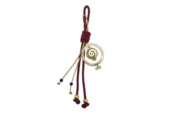 Εντυπωσιακό κρεμαστό γούρι με έντονα χρώματα, που συνδυάζει το βαθύ κόκκινο με χρυσές λεπτομέρειες, δημιουργώντας μια αίσθηση πολυτέλειας και εορταστικού πνεύματος. Το σχέδιο περιλαμβάνει έναν περίτεχνο κύκλο με συμβολική χάραξη, διακοσμημένο με ένα διακριτικό χρυσό ρόδι, σύμβολο καλοτυχίας και αφθονίας. Τα διακοσμητικά κορδόνια με τις χρυσαφένιες και μαύρες λεπτομέρειες ενισχύουν τη φινέτσα του, καθιστώντας το ιδανικό δώρο για το νέο έτος