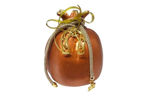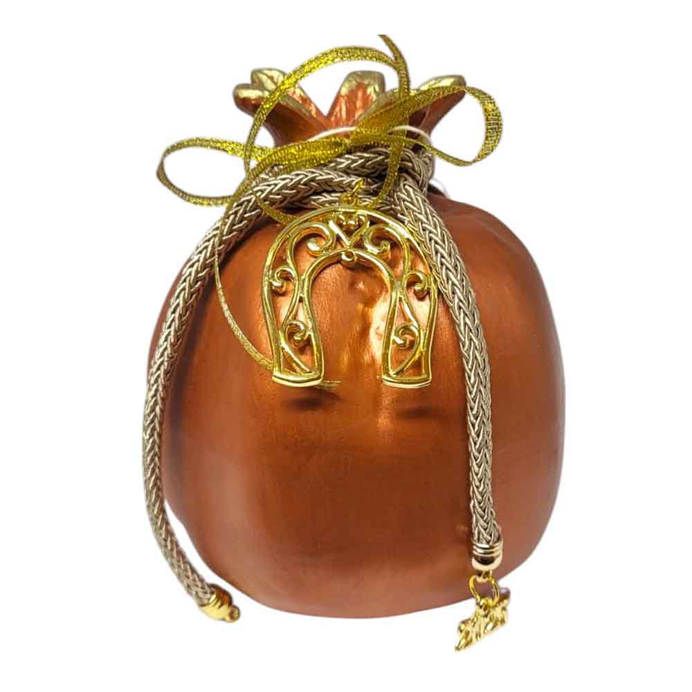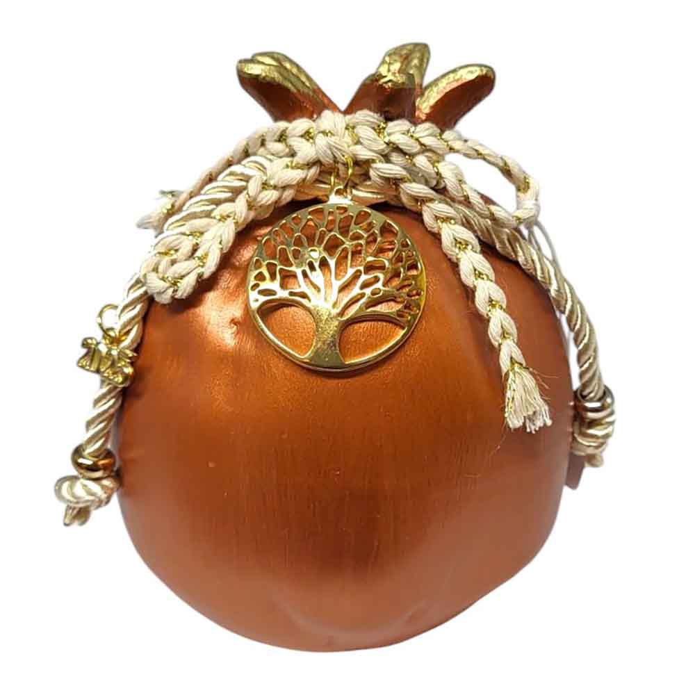Αυτό το κεραμικό ρόδι, με ματ επιφάνειά του σε κεραμιδί χρώμα , αποπνέει κομψότητα και φινέτσα. Οι χρυσές λεπτομέρειες στο επάνω μέρος και οι περίτεχνες διακοσμήσεις, όπως το μεταλλικό στοιχείο με το δέντρο , το καθιστούν ιδανικό για δώρο ή διακοσμητικό στοιχείο. Είναι ένα ξεχωριστό κομμάτι που συνδυάζει την παραδοσιακή έννοια της καλής τύχης με μοντέρνα αισθητική.
