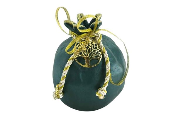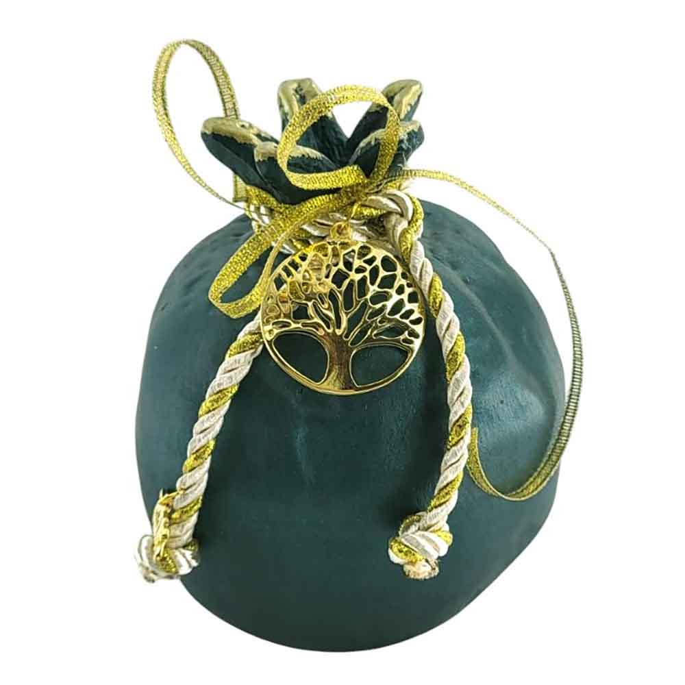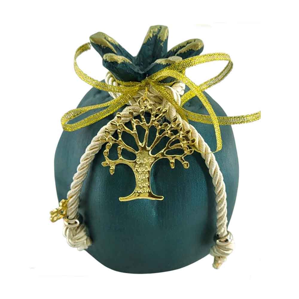 Αυτό το κεραμικό ρόδι, με ματ επιφάνειά του σε κυπαρισσί χρώμα , αποπνέει κομψότητα και φινέτσα. Οι χρυσές λεπτομέρειες στο επάνω μέρος και οι περίτεχνες διακοσμήσεις, όπως το μεταλλικό στοιχείο με το δέντρο , το καθιστούν ιδανικό για δώρο ή διακοσμητικό στοιχείο. Είναι ένα ξεχωριστό κομμάτι που συνδυάζει την παραδοσιακή έννοια της καλής τύχης με μοντέρνα αισθητική.