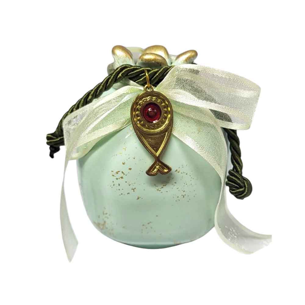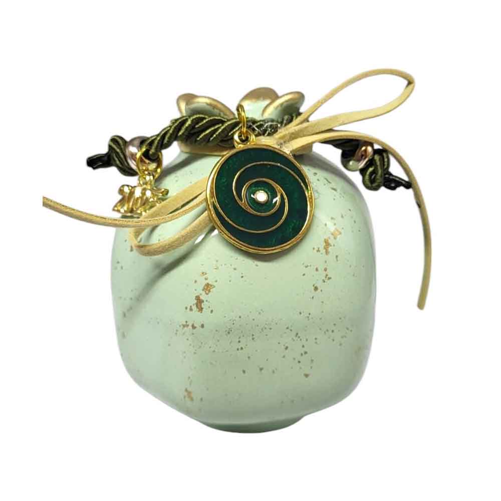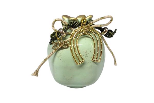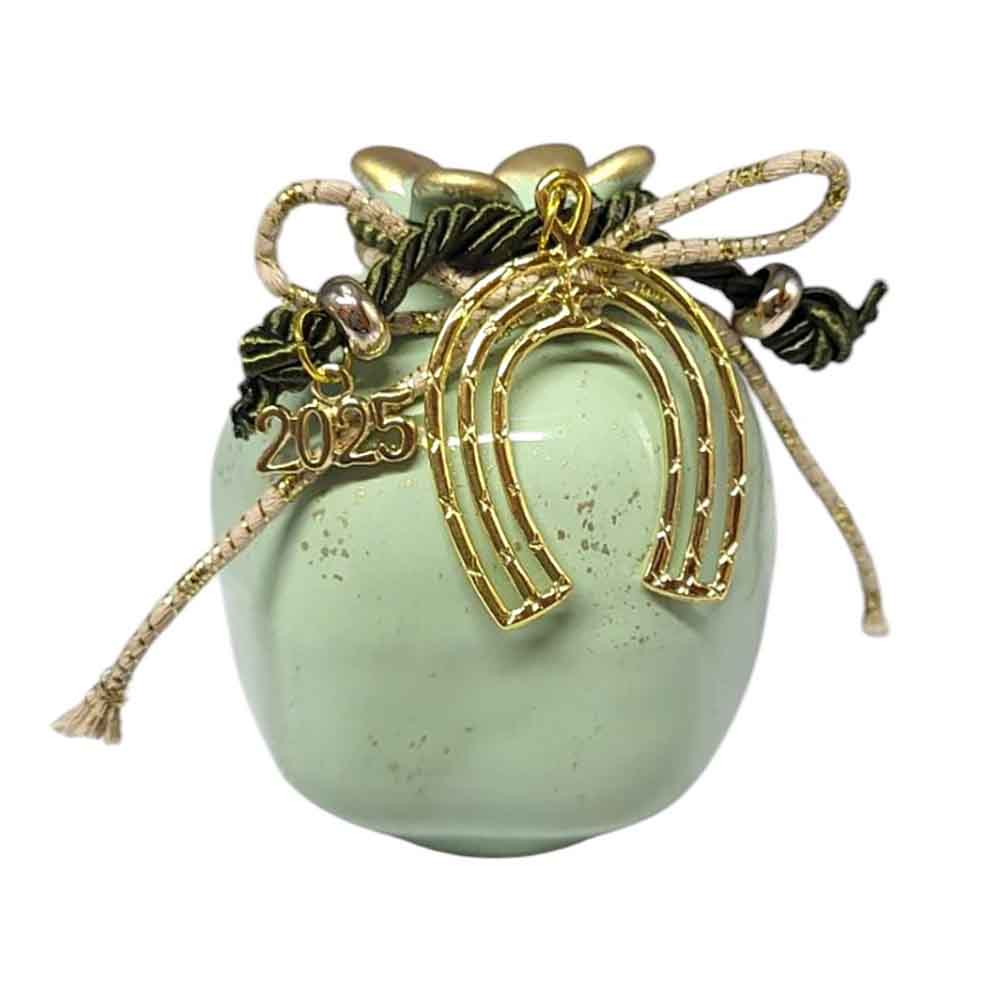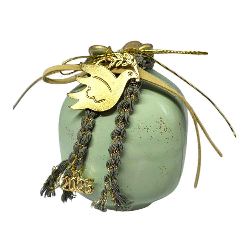Χειροποίητο κεραμικό ρόδι σε πράσινο απαλό γυαλιστερό χρώμα με χρυσές λεπτομέρειες .Οι χρυσές λεπτομέρειες στο επάνω μέρος και οι περίτεχνες διακοσμήσεις, όπως το μεταλλικό στοιχείο με το περιστέρι, η επιγραφή του νέου έτους "2025", το καθιστούν ιδανικό για δώρο ή διακοσμητικό στοιχείο. Είναι ένα ξεχωριστό κομμάτι που συνδυάζει την παραδοσιακή έννοια της καλής τύχης με μοντέρνα αισθητική.