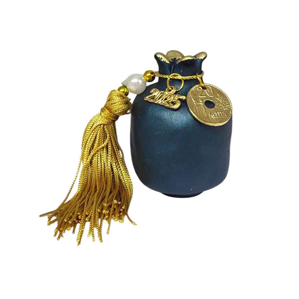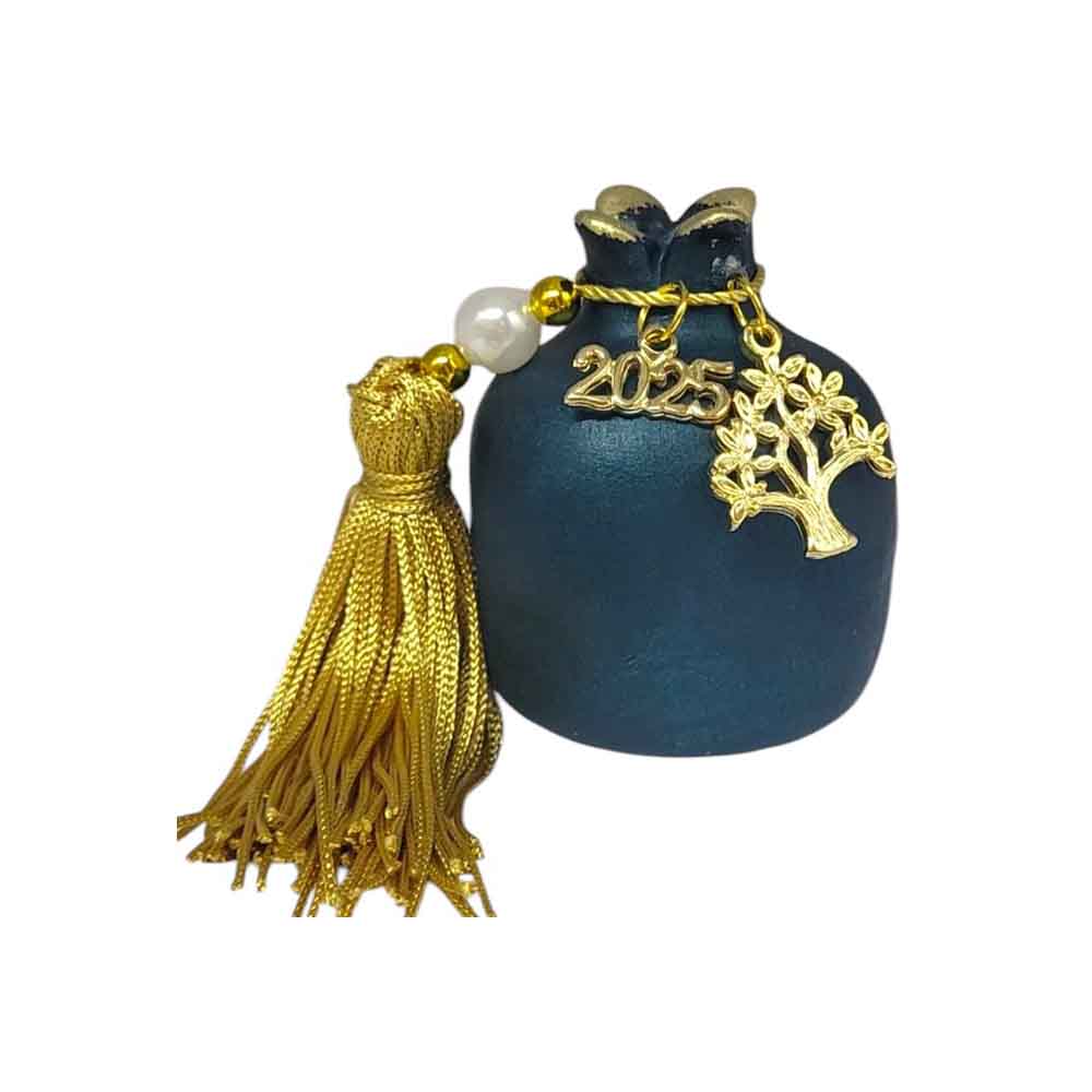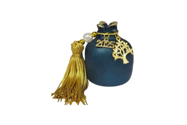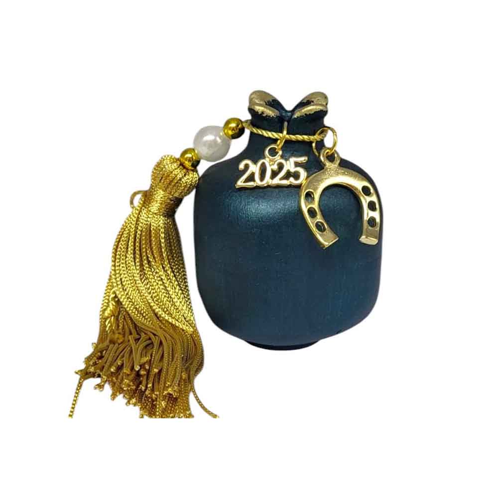 Αυτό το γούρι ρόδι είναι ένα κομψό διακοσμητικό σύμβολο τύχης και ευημερίας. Έχει κεραμικό σώμα σε κυπαρισσομπλέ χρώμα, με λαμπερές χρυσές λεπτομέρειες, όπως το φύλλο στην κορυφή και τη χρυσή μεταλλική επιγραφή "2025". Διαθέτει επίσης χρυσή φούντα με υφή υφάσματος που προσδίδει μια αίσθηση πολυτέλειας. Συνοδεύεται από ένα μικρό μεταλλικό πέταλο σε χρυσό χρώμα , που ενισχύουν τον συμβολισμό της της καλής τύχης. Το σύνολο είναι διακοσμημένο με προσοχή στη λεπτομέρεια, καθιστώντας το ιδανικό δώρο για την Πρωτοχρονιά ή για κάθε περίσταση που θέλετε να προσφέρετε καλοτυχία και θετική ενέργεια.