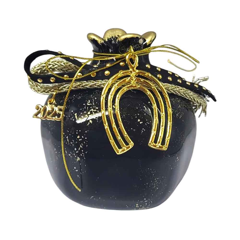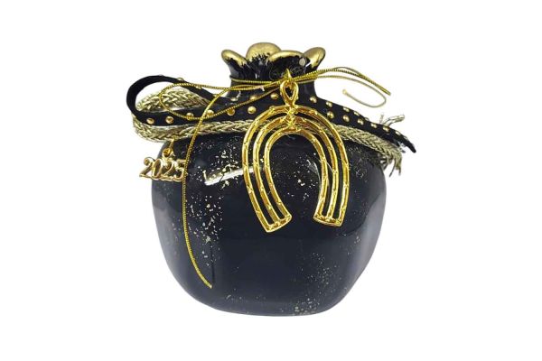 Αυτό το κεραμικό ρόδι, με τη γυαλιστερή επιφάνειά του σε μαύρο χρώμα , αποπνέει κομψότητα και φινέτσα. Οι χρυσές λεπτομέρειες στο επάνω μέρος και οι περίτεχνες διακοσμήσεις, όπως το μεταλλικό στοιχείο με το πέταλο και η επιγραφή του νέου έτους "2025" , το καθιστούν ιδανικό για δώρο ή διακοσμητικό στοιχείο. Είναι ένα ξεχωριστό κομμάτι που συνδυάζει την παραδοσιακή έννοια της καλής τύχης με μοντέρνα αισθητική.