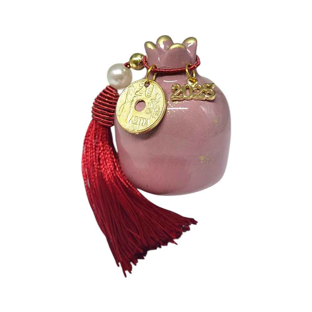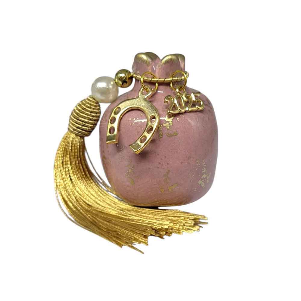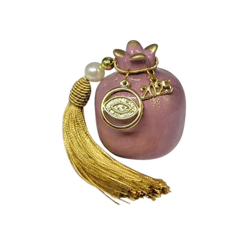 Αυτό το κεραμικό ρόδι, με τη γυαλιστερή επιφάνειά του σε ροζαπόχρωση , αποπνέει κομψότητα και φινέτσα. Οι χρυσές λεπτομέρειες στο επάνω μέρος και οι περίτεχνες διακοσμήσεις, όπως το μεταλλικό στοιχείο με το πέταλο, η επιγραφή του νέου έτους "2025" και το χρυσό κρόσσι, το καθιστούν ιδανικό για δώρο ή διακοσμητικό στοιχείο. Είναι ένα ξεχωριστό κομμάτι που συνδυάζει την παραδοσιακή έννοια της καλής τύχης με μοντέρνα αισθητική.
