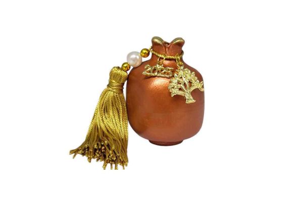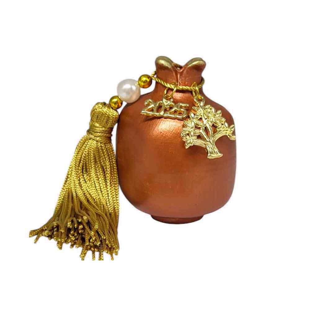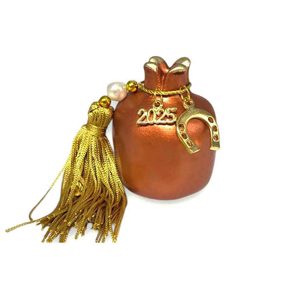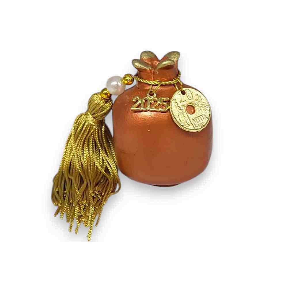 Αυτό το γούρι ρόδι είναι ένα κομψό διακοσμητικό σύμβολο τύχης και ευημερίας. Έχει κεραμικό σώμα σε ζεστό χάλκινο-πορτοκαλί χρώμα, με λαμπερές χρυσές λεπτομέρειες, όπως το φύλλο στην κορυφή και τη χρυσή μεταλλική επιγραφή "2025". Διαθέτει επίσης χρυσή φούντα με υφή υφάσματος που προσδίδει μια αίσθηση πολυτέλειας. Συνοδεύεται από ένα μικρό μεταλλικό κέρμα σε χρυσό χρώμα και μια λευκή πέρλα, που ενισχύουν τον συμβολισμό της αφθονίας και της καλής τύχης. Το σύνολο είναι διακοσμημένο με προσοχή στη λεπτομέρεια, καθιστώντας το ιδανικό δώρο για την Πρωτοχρονιά ή για κάθε περίσταση που θέλετε να προσφέρετε καλοτυχία και θετική ενέργεια.
