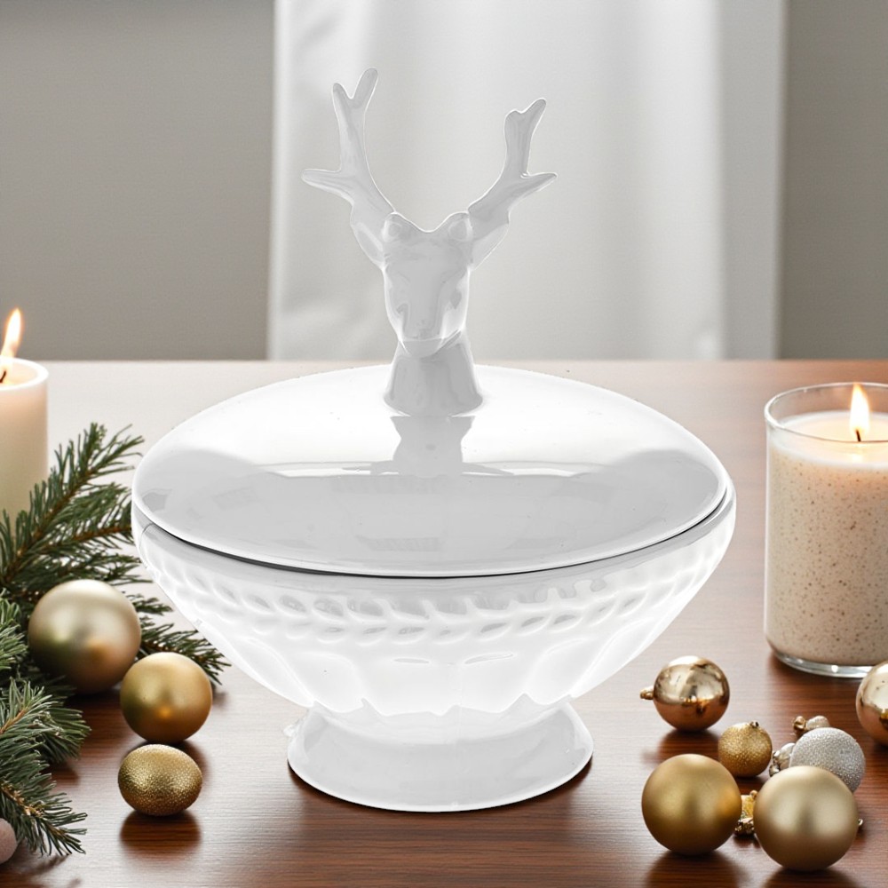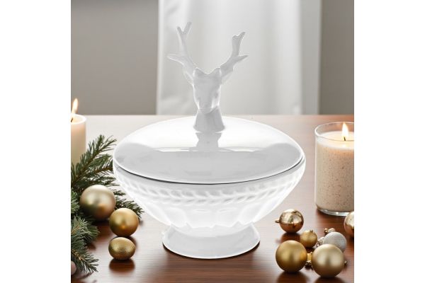 Φέρε στο σπίτι σου την κομψότητα των γιορτών με αυτή τη λευκή κεραμική μπισκοτιέρα με καπάκι σε σχήμα κεφαλιού ταράνδου. Ο minimal σχεδιασμός της με τις εκλεπτυσμένες λεπτομέρειες την καθιστά ιδανική για γλυκίσματα, μπισκότα ή σοκολατάκια, ενώ μπορεί να χρησιμοποιηθεί και ως διακοσμητικό στοιχείο σε μπουφέ, ράφι ή τραπέζι.