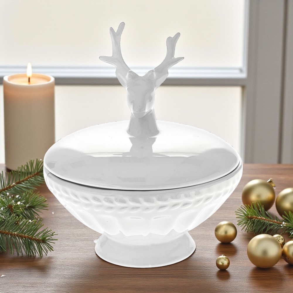 Λευκή Κεραμική Μπισκοτιέρα με καπάκι Κεφάλι Ταράνδου 18x20cm 82123 Ηλιάδης