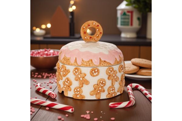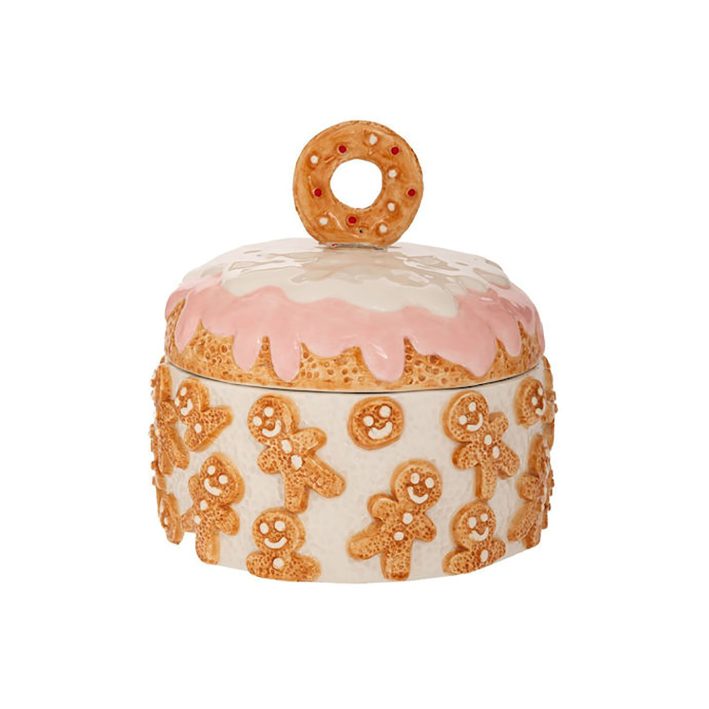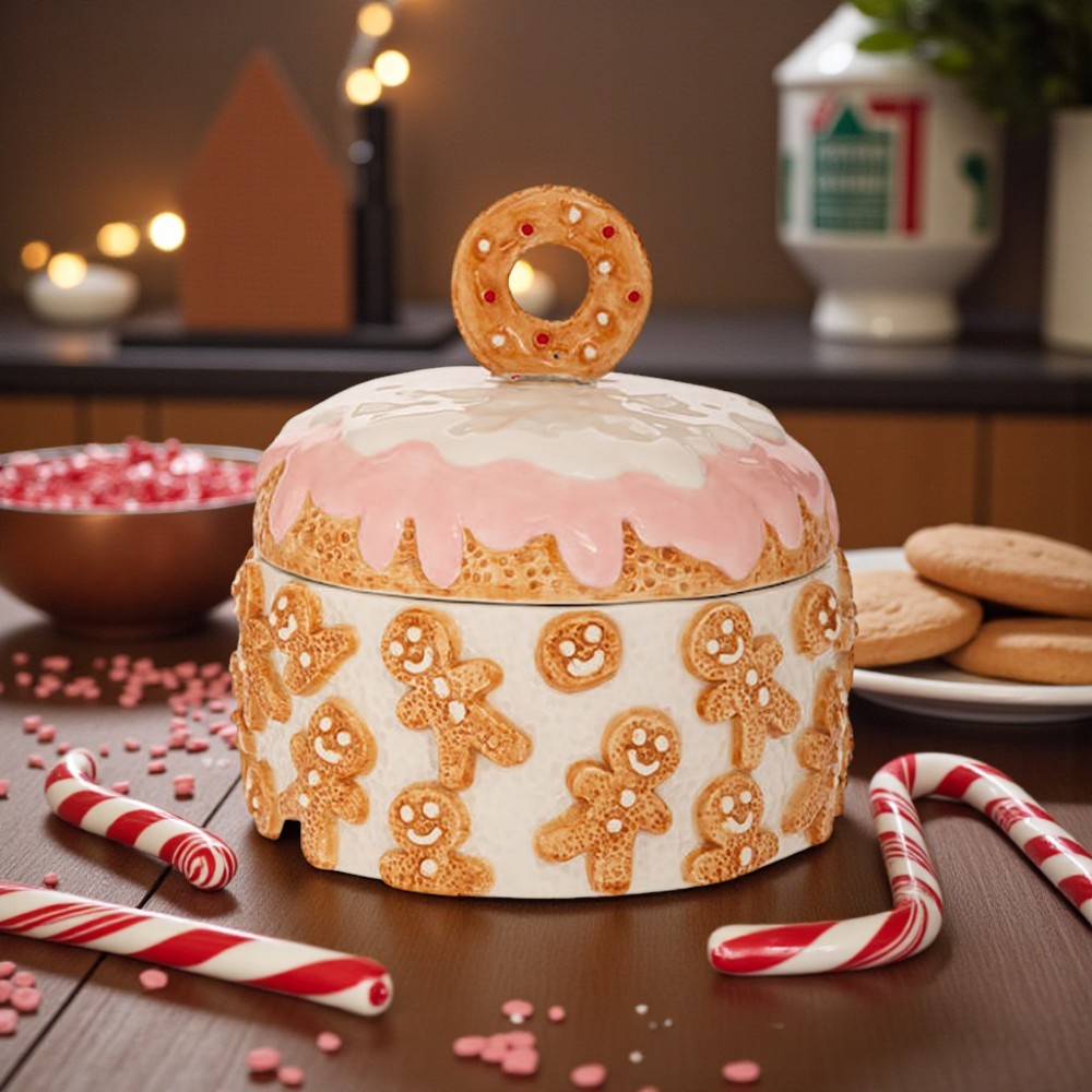 Μια μπισκοτιέρα που μοιάζει με γιορτινό γλυκό, γεμάτη χαρά και παιδική ανεμελιά. Με ροζ “γλάσο” και χαμογελαστά gingerbread γύρω γύρω, φέρνει στο σπίτι τη μυρωδιά της κανέλας και τη θαλπωρή των Χριστουγέννων. Ιδανική για να κρατά μπισκότα, καραμέλες ή απλώς τη γλυκιά διάθεση των γιορτών.