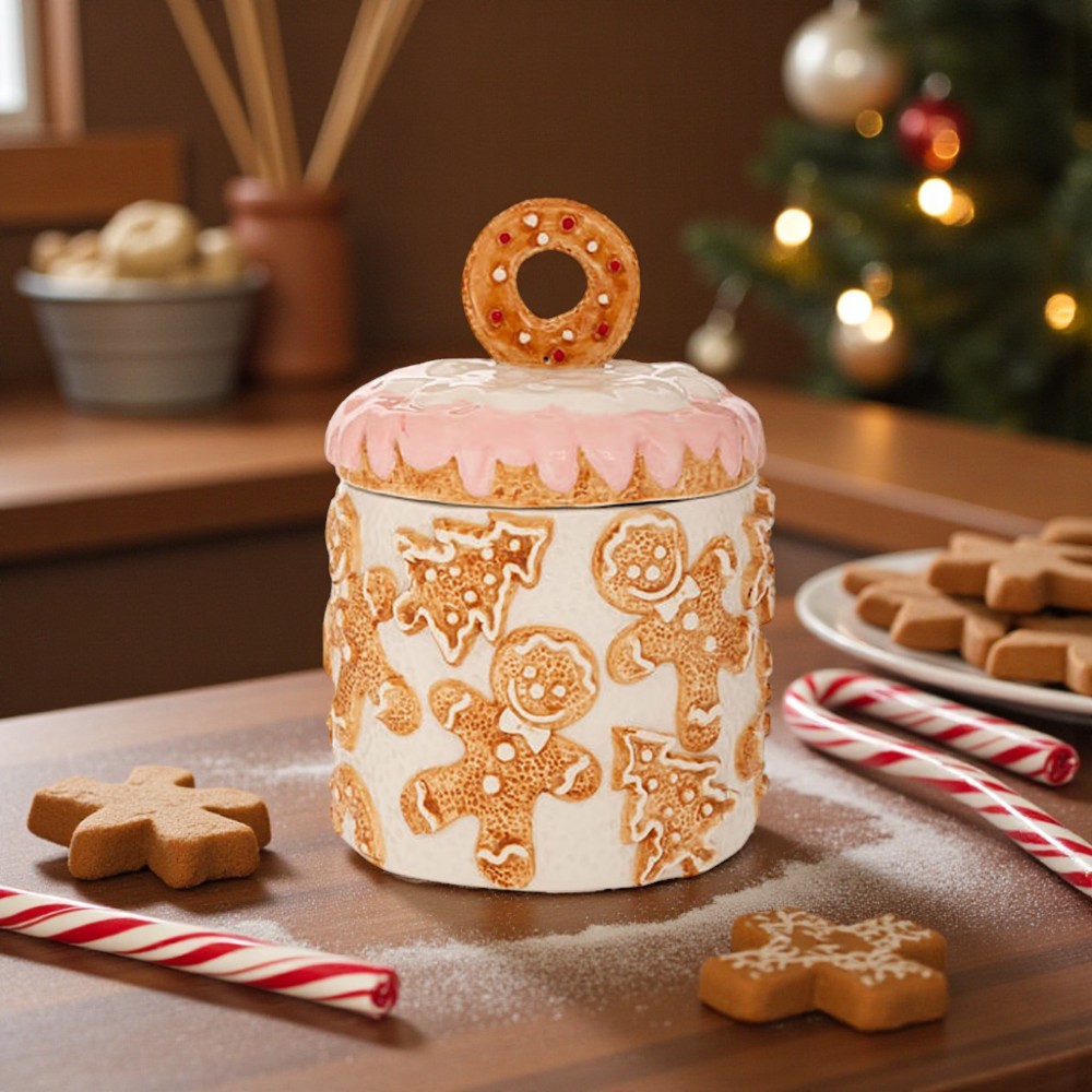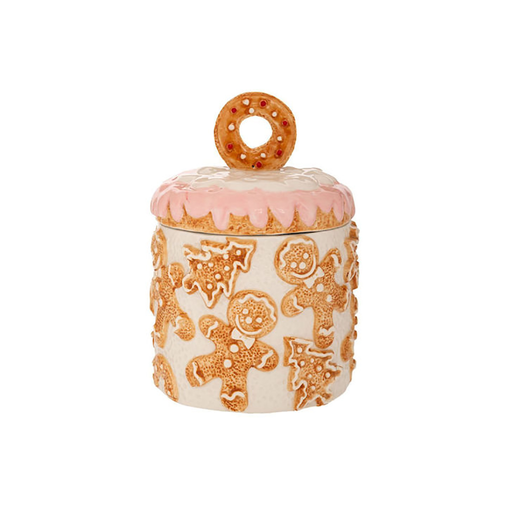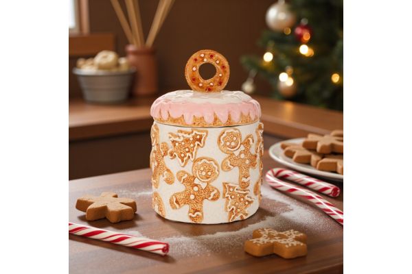 Μια μπισκοτιέρα που μοσχοβολά Χριστούγεννα! Με παιχνιδιάρικο σχέδιο gingerbread και ροζ “γλάσο” στο καπάκι, φέρνει στο σπίτι τη γλυκιά θαλπωρή των γιορτών και τις πιο όμορφες αναμνήσεις από παιδικά Χριστούγεννα. Ιδανική για να γεμίσει με μπισκότα, γλυκά ή μικρές στιγμές χαράς.