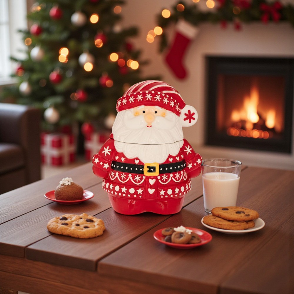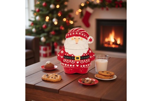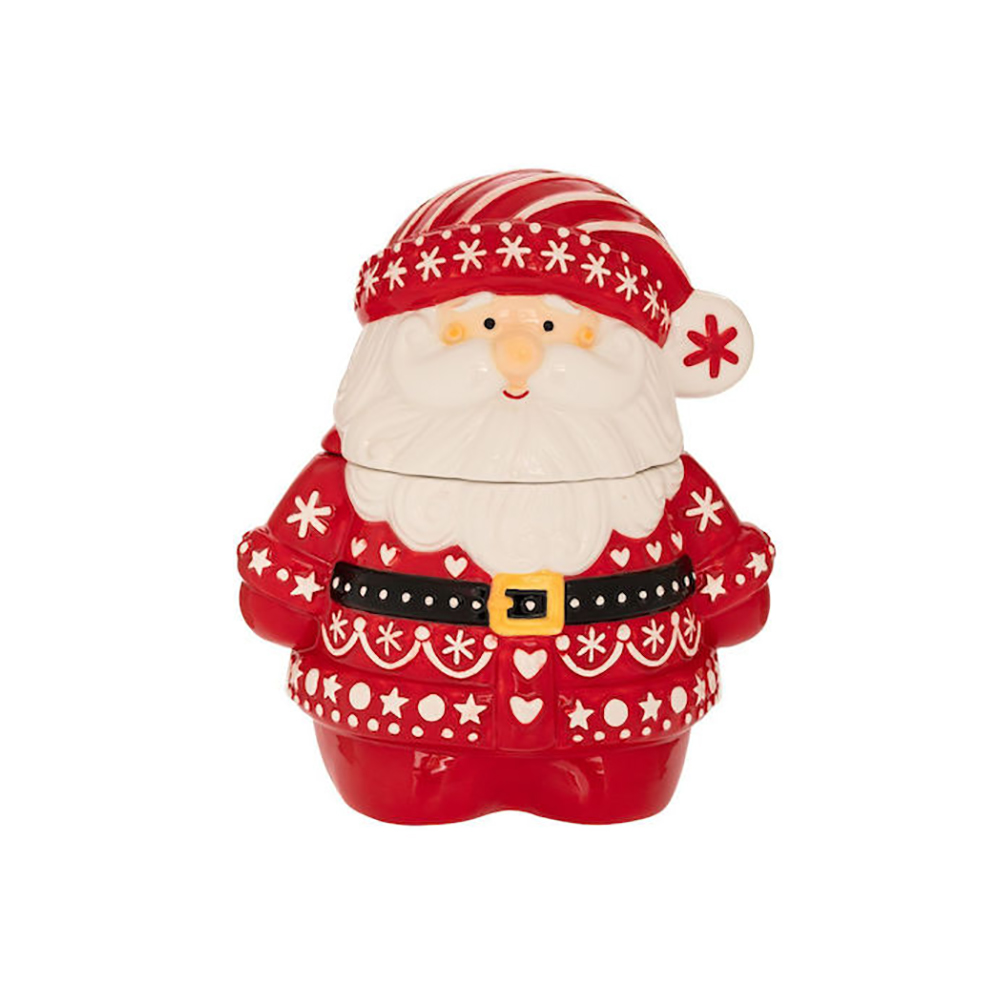 Ένας Άγιος Βασίλης γεμάτος χαρά, έτοιμος να φέρει τη γλύκα των Χριστουγέννων στο σπίτι! Με το ζεστό κόκκινο χρώμα, τις παιχνιδιάρικες λεπτομέρειες και το χαμογελαστό του πρόσωπο, αυτή η μπισκοτιέρα ξυπνά παιδικές αναμνήσεις και κάνει κάθε στιγμή πιο γιορτινή. Ιδανική για να φυλάει μπισκότα, σοκολατάκια ή μικρές εκπλήξεις που σκορπούν χαμόγελα.
