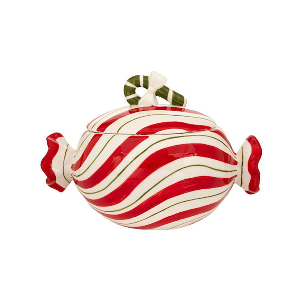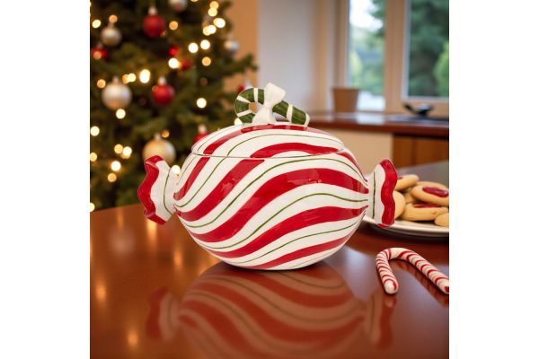 Με ριγέ σχέδιο σε κόκκινες, λευκές και πράσινες αποχρώσεις, φέρνει στο χώρο τη γλυκιά αίσθηση των Χριστουγέννων και τη μαγεία της παιδικής αθωότητας. Το καπάκι της με φιόγκο σε σχήμα ζαχαρωτού την κάνει ιδανική για να φυλάτε μπισκότα, καραμέλες ή σοκολατάκια, ενώ παράλληλα λειτουργεί ως ένα διακοσμητικό στολίδι που γεμίζει χαμόγελα και θαλπωρή.