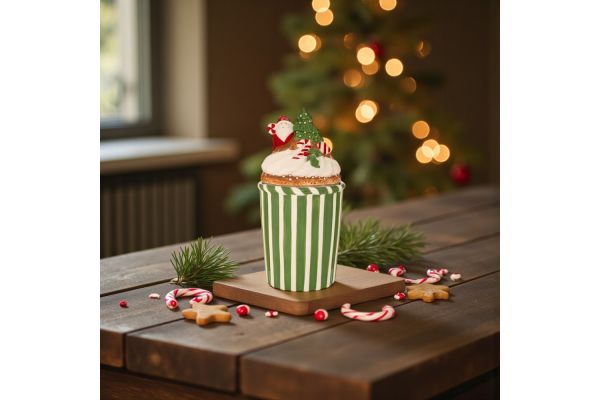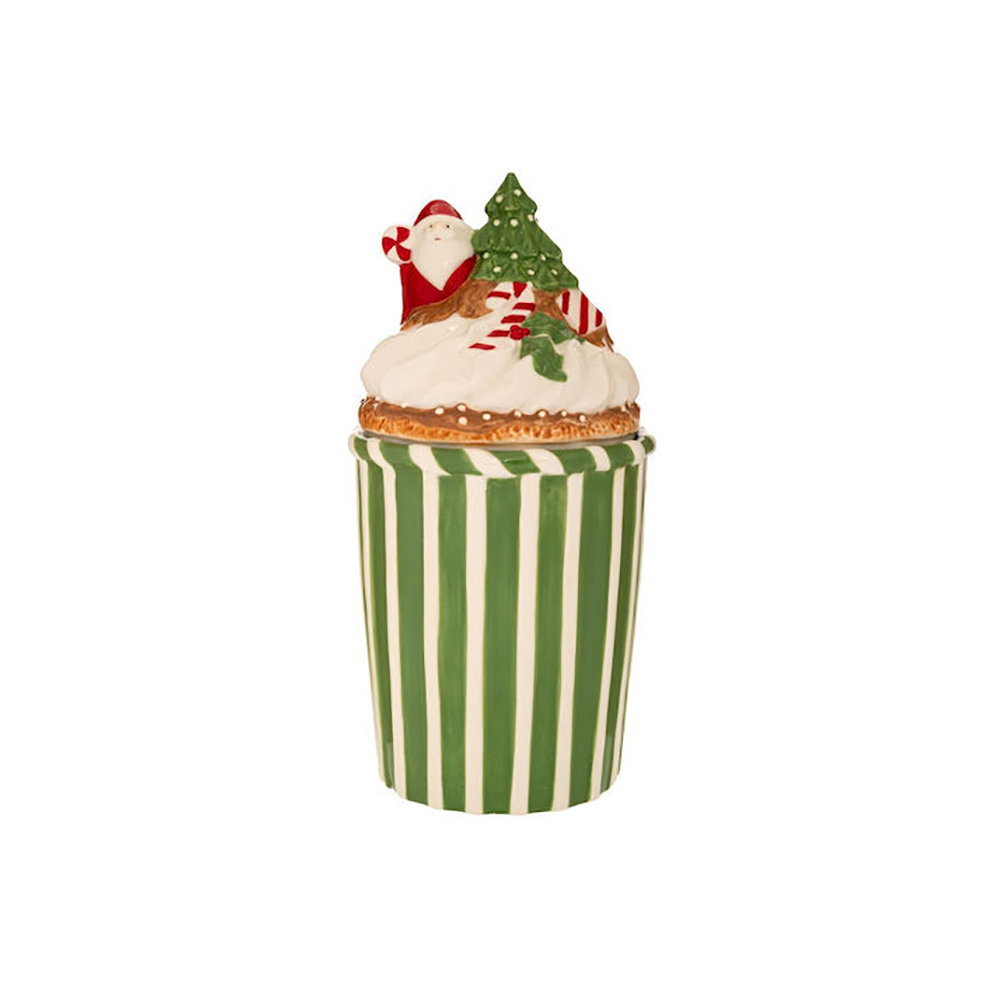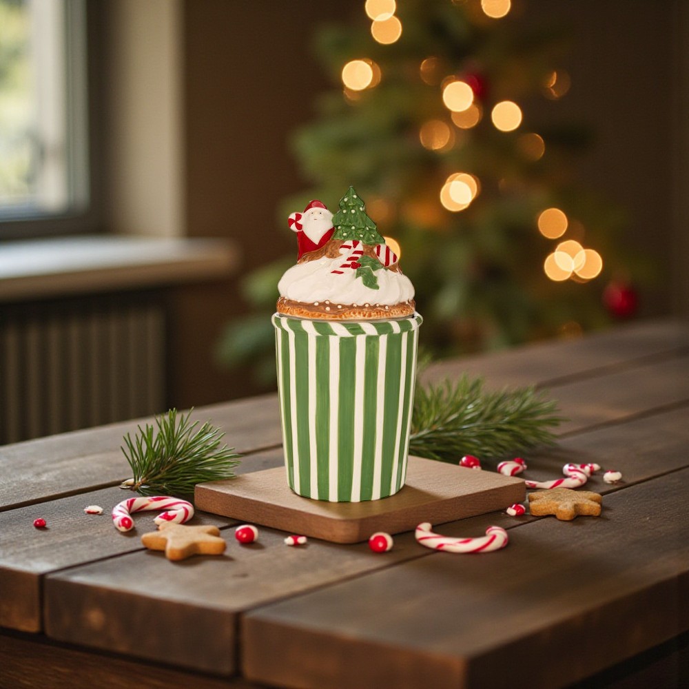 Μια μπισκοτιέρα που μοιάζει να ξεπήδησε από το πιο γλυκό χριστουγεννιάτικο όνειρο. Με τις πράσινες ρίγες, τη φουσκωτή “κρέμα” και τον Άγιο Βασίλη να ξεπροβάλλει δίπλα στο δέντρο, φέρνει στο σπίτι τη χαρά, τη ζεστασιά και την παιδική ανυπομονησία των γιορτών. Ιδανική για να κρύβει μέσα της τις πιο λαχταριστές γιορτινές λιχουδιές — και να χαρίζει χαμόγελα κάθε φορά που ανοίγει.