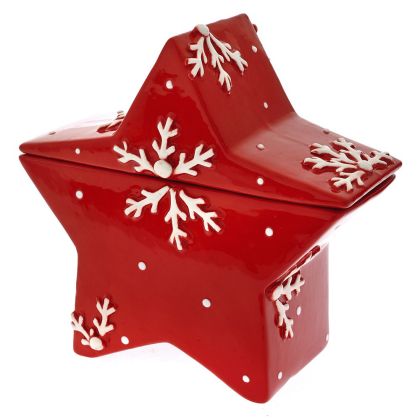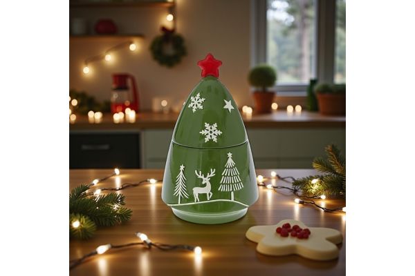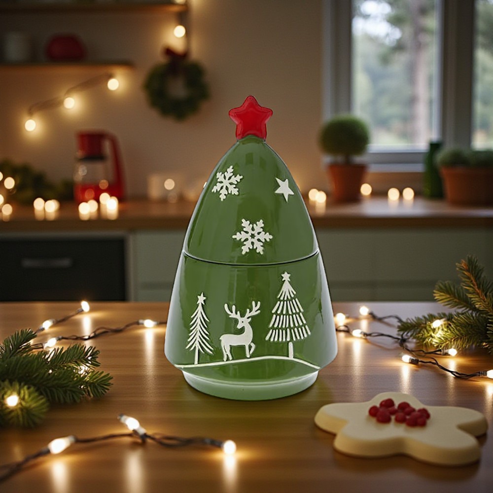 Μια μπισκοτιέρα που φέρνει τη μαγεία των Χριστουγέννων στο σπίτι. Με το σχήμα χριστουγεννιάτικου δέντρου, τις λευκές νιφάδες και το μικρό κόκκινο αστέρι στην κορυφή, κρύβει μέσα της τη γλύκα των γιορτών και τις πιο τρυφερές στιγμές γύρω από το τραπέζι. Ιδανική για να φυλάξει μπισκότα, σοκολατάκια ή μικρές εκπλήξεις, είναι ένα στολίδι γεμάτο θαλπωρή και χαμόγελα.