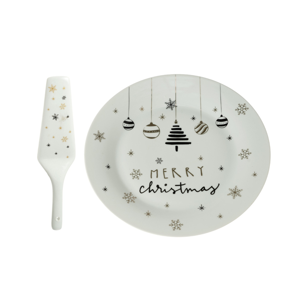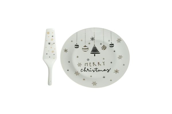 Στρώστε το πιο γιορτινό τραπέζι με αυτή τη χριστουγεννιάτικη πορσελάνινη πιατέλα με σπάτουλα, σε λευκή βάση με χρυσό και μαύρο σχέδιο “Merry Christmas”, μπάλες και νιφάδες. Ιδανική για βασιλόπιτα, τούρτες και γλυκά των γιορτών, χαρίζει στο σερβίρισμα μια κομψή, αλλά παιχνιδιάρικη χριστουγεννιάτικη πινελιά, ενώ η σπάτουλα ολοκληρώνει το σετ και το κάνει ιδανικό και για δώρο.