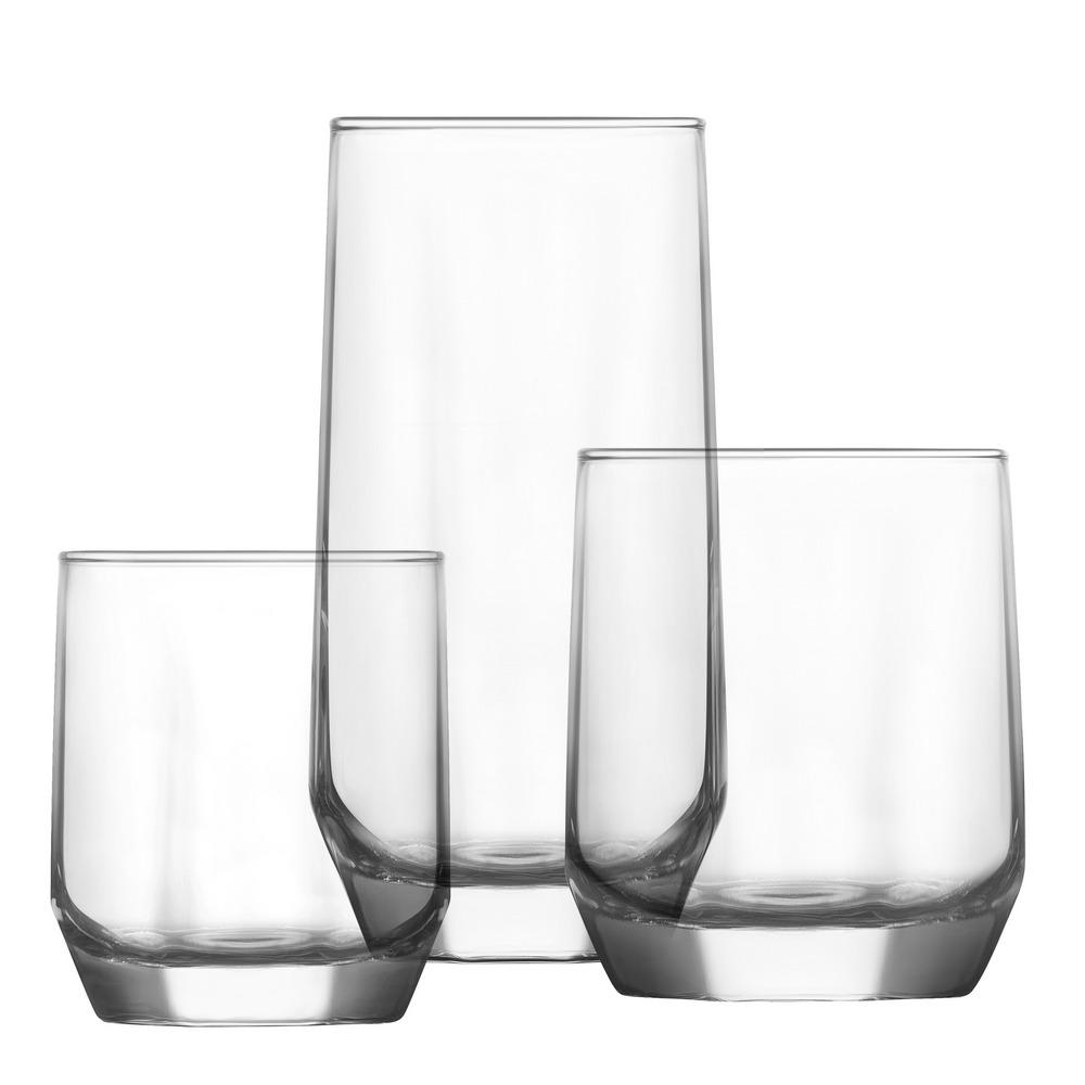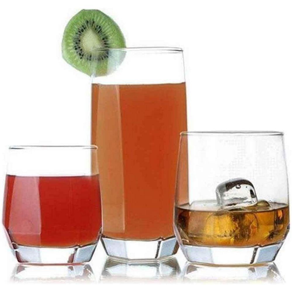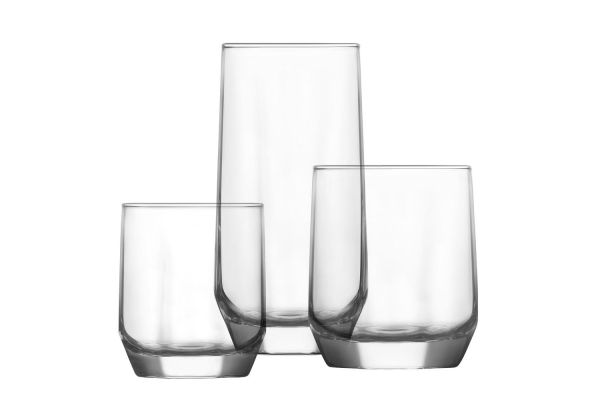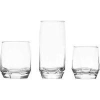 The set consists of: 6 sqm Tube glasses 385cc, 6 sqm Whiskey glasses 310cc, 6 sqm Wine glasses 215cc