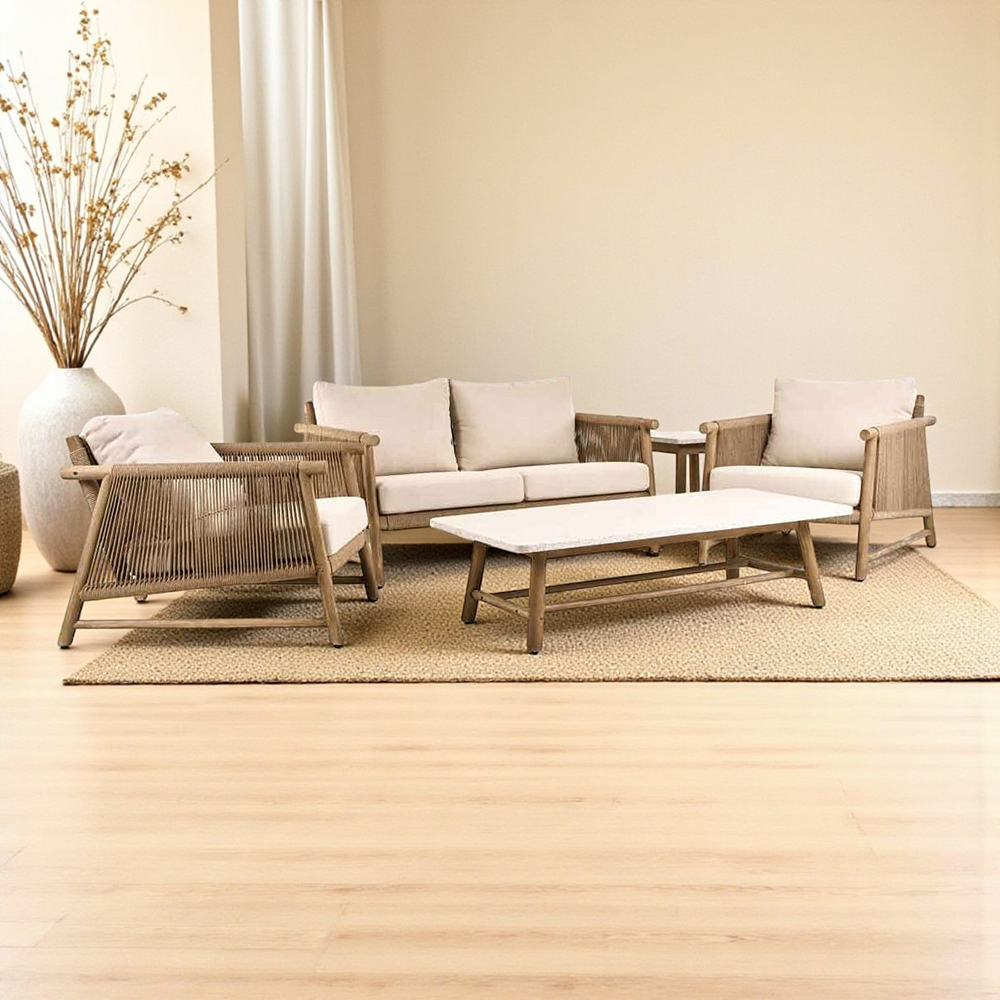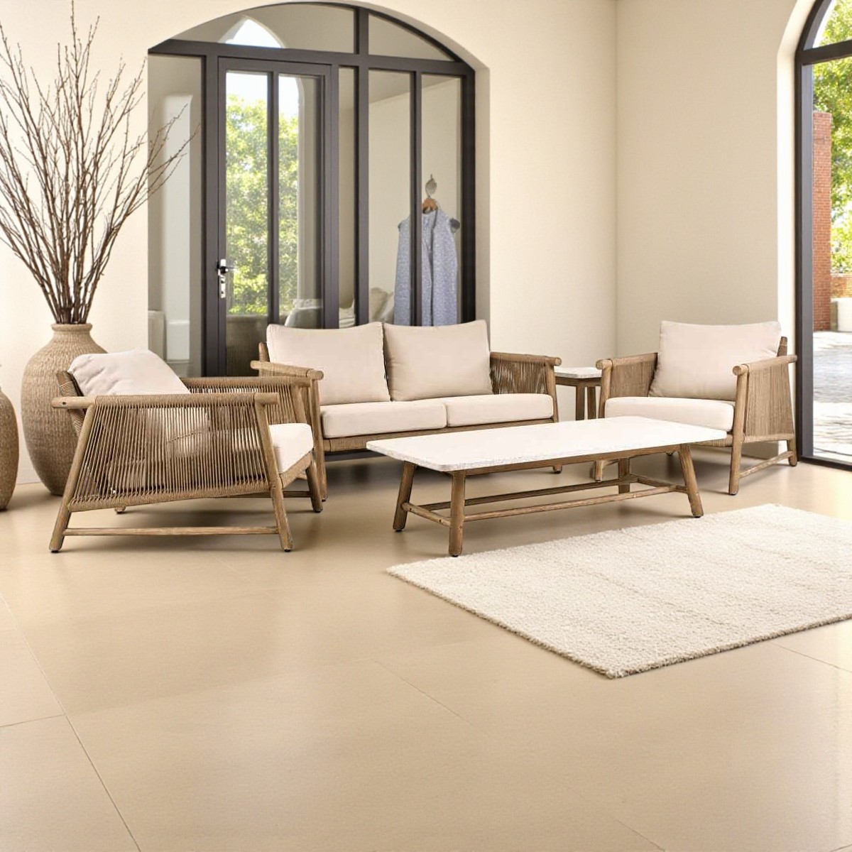 Ο ανθεκτικός σκελετός από αλουμίνιο συνδυάζεται με VPR σχοινί υψηλής αντοχής (6 mm), δημιουργώντας μια καλαίσθητη και ταυτόχρονα πρακτική επιλογή για κάθε εξωτερικό περιβάλλον. Τα αδιάβροχα μαξιλάρια προσφέρουν άνεση και αντοχή στις καιρικές συνθήκες, ενώ οι επιφάνειες από ξύλο ακακίας δίνουν μια φυσική, ζεστή αίσθηση που ξεχωρίζει.