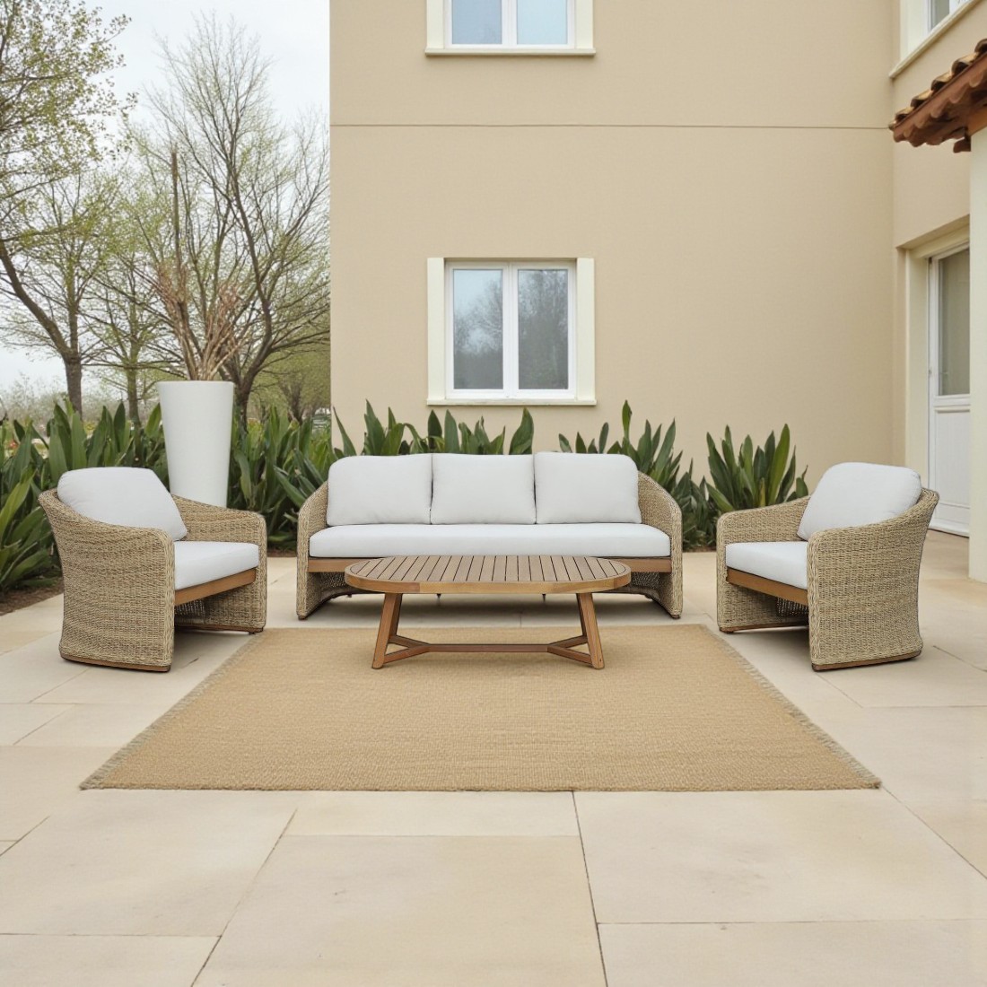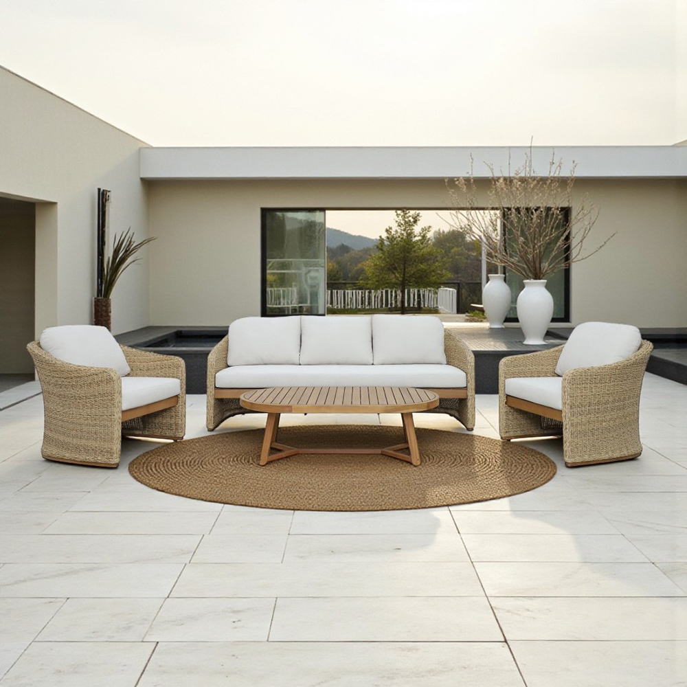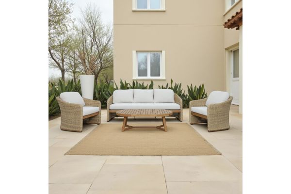 The Florida  collection is a refined choice of living room for outdoor and semi-sacred spaces, combining natural materials with high durability and aesthetics. Its frame is lined with durable, woven wicker that gives a natural and earthy feel, while the table is made of solid teak wood, known for its durability to humidity and weather conditions. The pillows have high quality waterproof fabric, suitable for both outdoors and indoors, and are filled with dense foam material that ensures excellent comfort. The set includes a three-seat sofa, two armchairs and a living room table, making an ideal choice for relaxation with style and comfort.