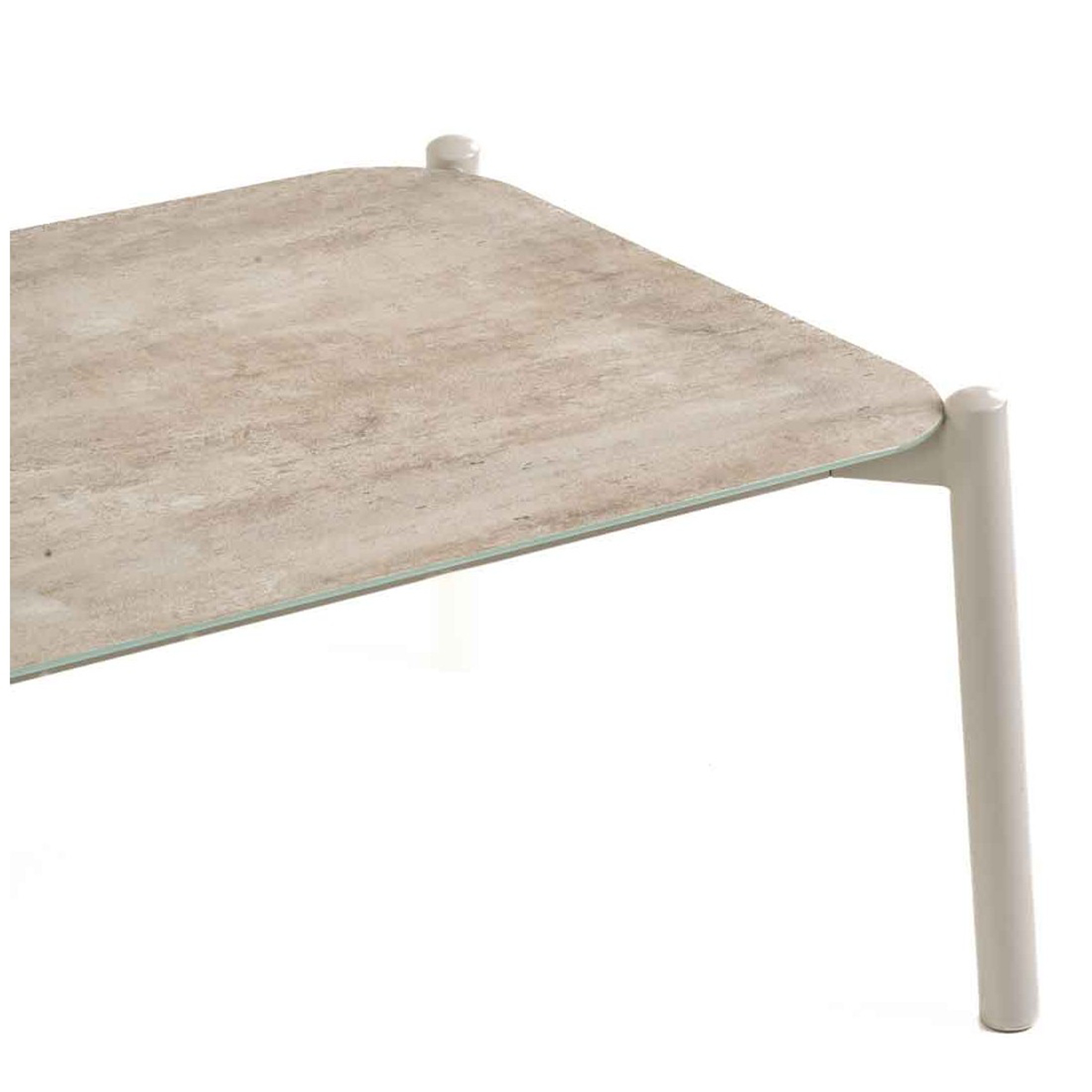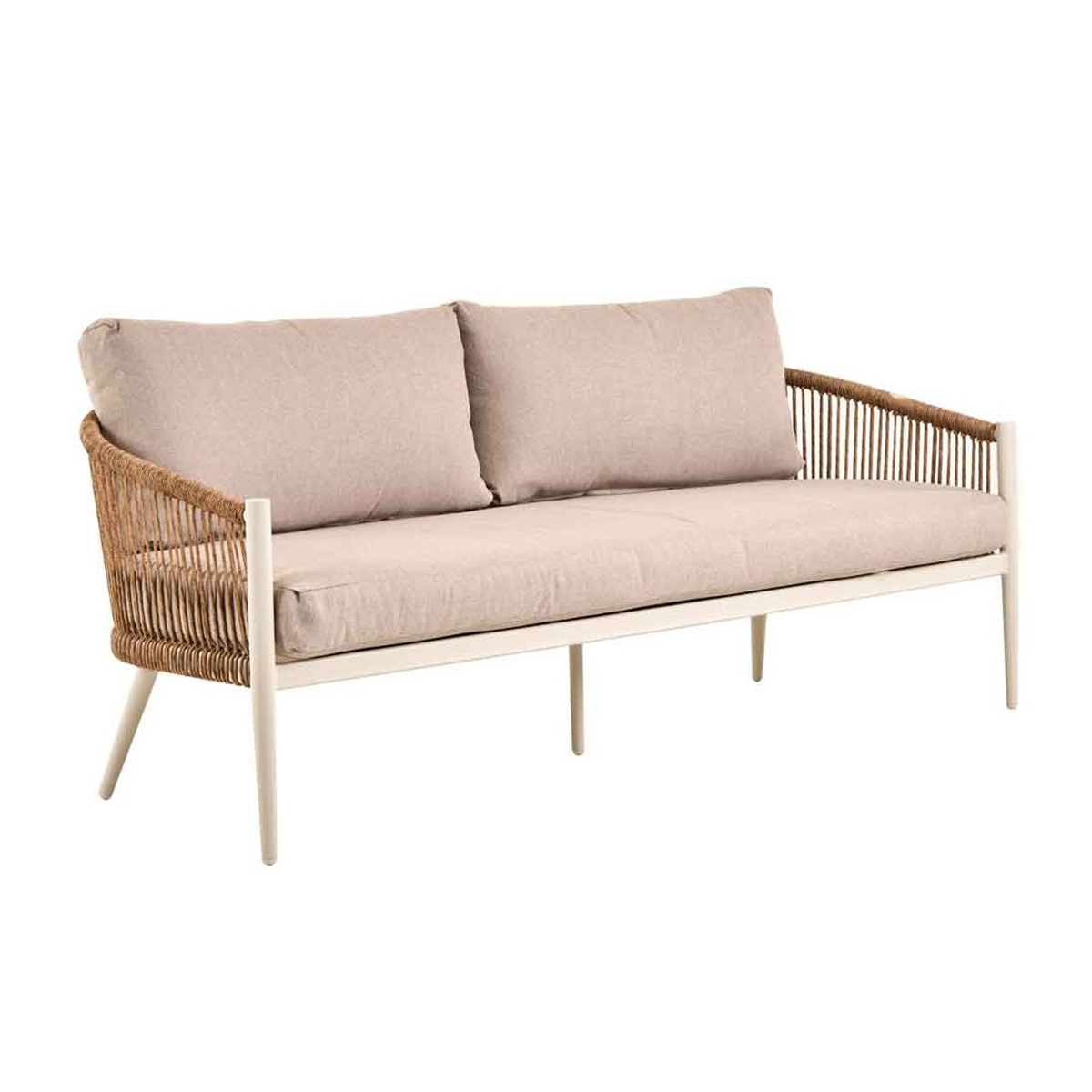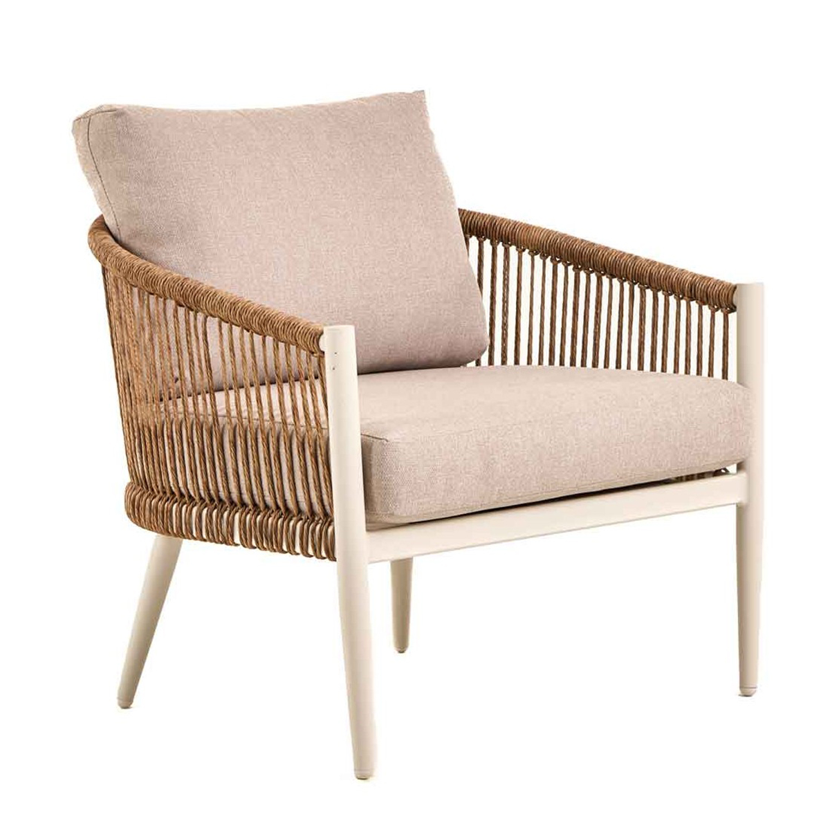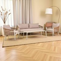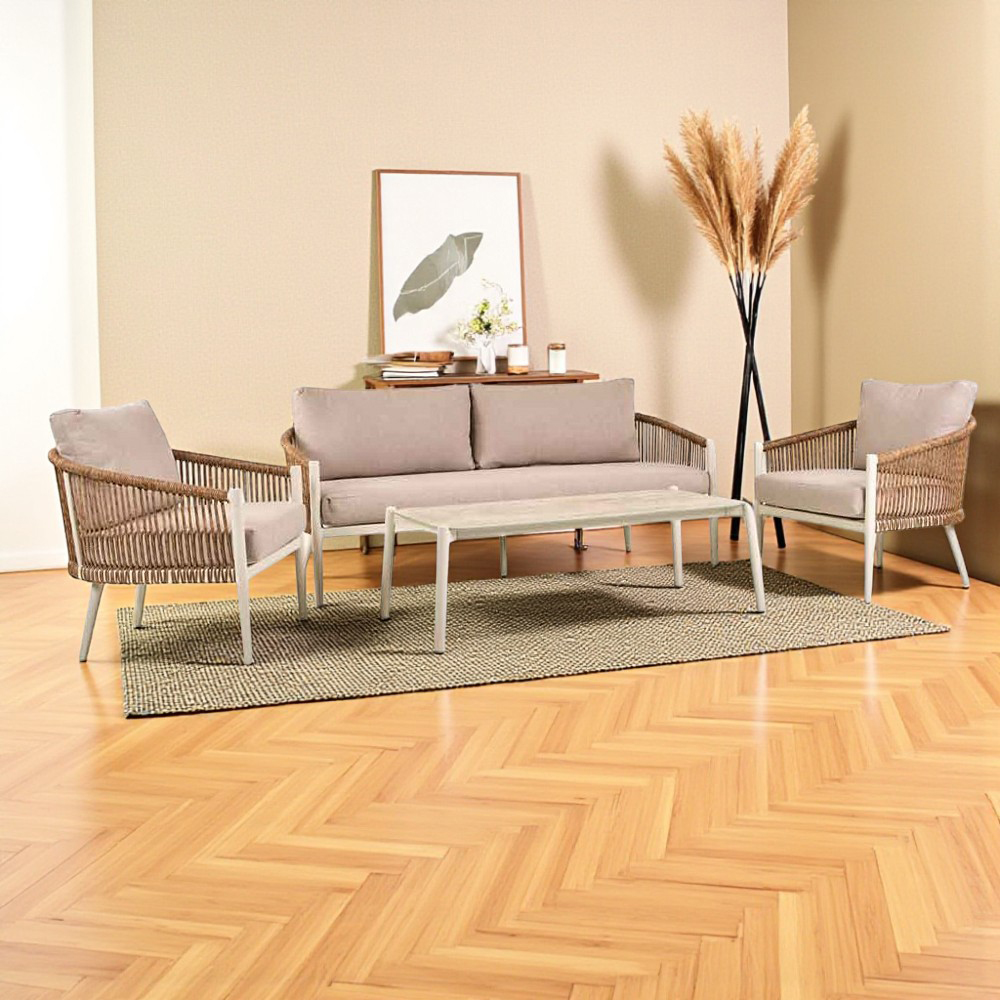 Το υφαντό σχοινί που επενδύει τις επιφάνειες δίνει μια μοντέρνα, φυσική πινελιά, ενώ η επιφάνεια του τραπεζιού από ξύλο Teak προσθέτει διαχρονική κομψότητα και μέγιστη αντοχή στις καιρικές συνθήκες. Τα μαξιλάρια με αδιάβροχο και πλενόμενο ύφασμα εξασφαλίζουν εύκολη συντήρηση και άνεση που διαρκεί.