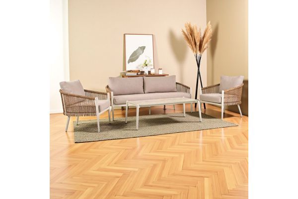 The woven rope that invests the surfaces gives a modern, natural touch, while the surface of the teak wood table adds timeless elegance and maximum weather resistance. The cushions with waterproof and washing fabric ensure easy maintenance and comfort that lasts.