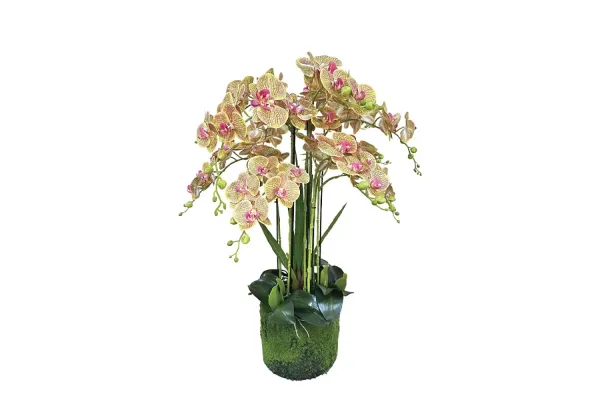 Η Real Touch Ορχιδέα σε απόχρωση λαχανί με ροζ ρίγες είναι μία από τις πιο ιδιαίτερες και elegant επιλογές διακόσμησης, συνδυάζοντας φυσικότητα με εντυπωσιακή χρωματική λεπτομέρεια. Τα άνθη διαθέτουν υψηλής ποιότητας Real Touch υφή, προσφέροντας απόλυτα ρεαλιστική αίσθηση και premium εμφάνιση, ενώ η βάση από βρύα ολοκληρώνει τη σύνθεση με φυσική και οργανική αισθητική.