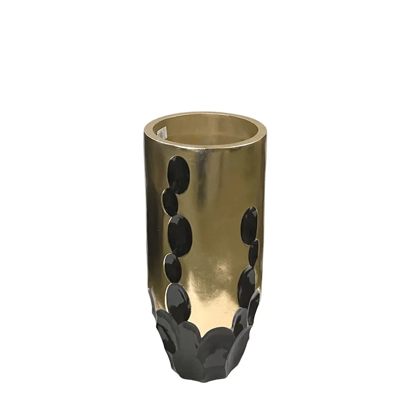 FIBERCLAY ΚΑΣΠΩ ΣΤΡΟΓΓΥΛΟ ΜΙΚΡΟ - ΧΡΩΜΑ: ΜΑΥΡΟ/ΧΡΥΣΟ - ΣΧΕΔΙΟ: ΚΥΚΛΙΚΑ ΚΟΙΛΩΜΑΤΑ - KIBΩΤΙΟ: 1 ΔΙΑΣΤΑΣΕΙΣ / DIMΕNSIONS: Φ33x70cm FIBERCLAY POT ROUND SMALL - COLOR: BLACK/GOLD - DESIGN: CIRCULAR HOLLOWS - BOX: 1