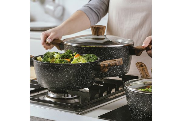 Η εξαιρετική και ανθεκτική αντικολλητική επίστρωση, εξασφαλίζει μεγάλη αντοχή στα γδαρσίματα και σε υψηλές θερμοκρασίες. Παράγονται με τέτοιο τρόπο ώστε να υπάρχει σημαντική μείωση εκπομπών του διοξειδίου του άνθρακα και δεν περιέχουν PFOA. Οι 5 αντικολλητικές επιστρώσεις προσδίδουν μακρά διάρκεια ζωής στα σκεύη. Εξασφαλίζουν απόλυτα υγιεινό μαγείρεμα, με τέλεια γεύση σαν να μαγειρεύετε σε φυσική πέτρα. Η αντιολισθητική, εργονομική λαβή με όψη ξύλου, παραμένει κρύα ακόμη και μετά από ώρες μαγειρέματος και δίνει τη δυνατότητα στον χρήστη να χειριστεί με ευκολία το σκεύος. Τα σκεύη της σειράς NATURE έχουνε κατασκευαστεί για να αντέχουν τις απότομες αλλαγές θερμοκρασίας και είναι πολύ εύκολα στο καθάρισμα.